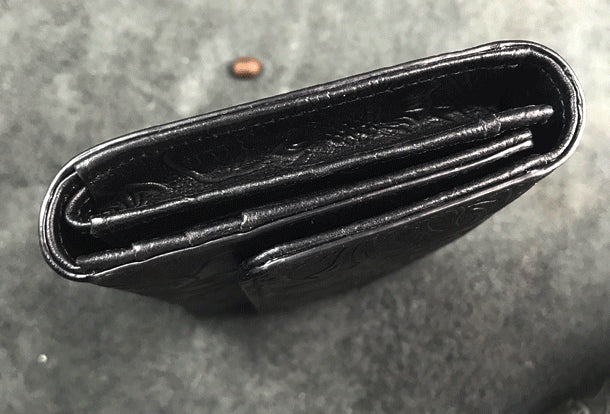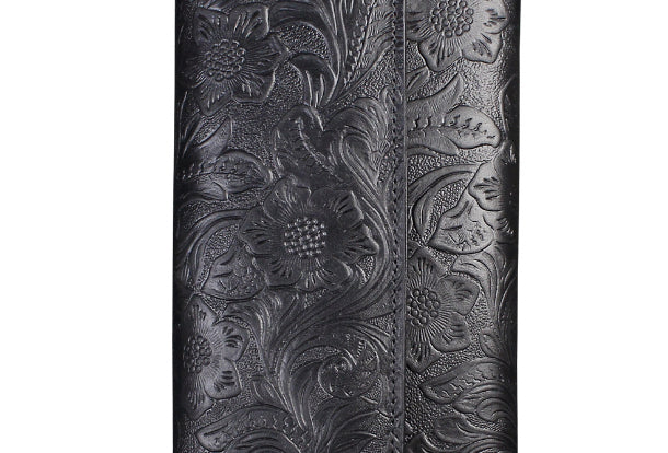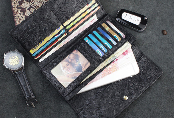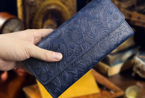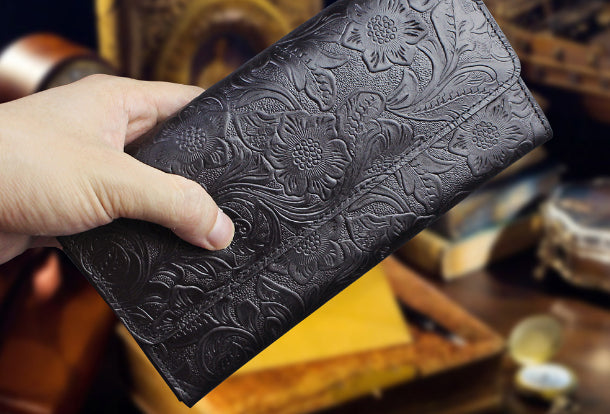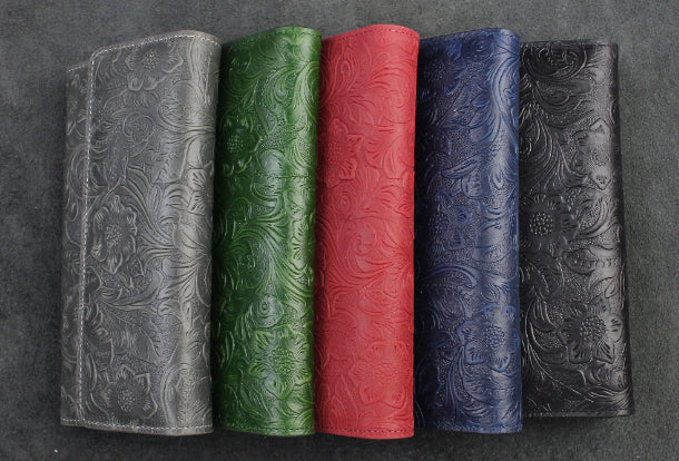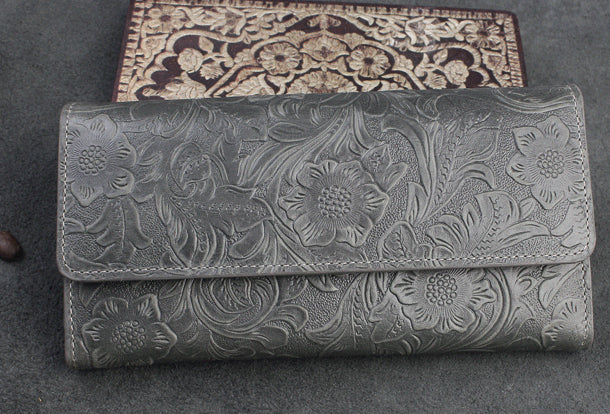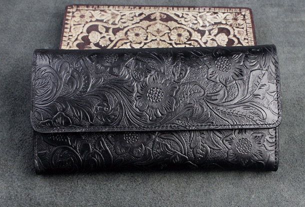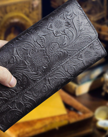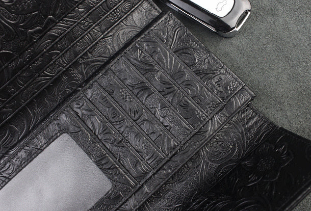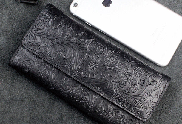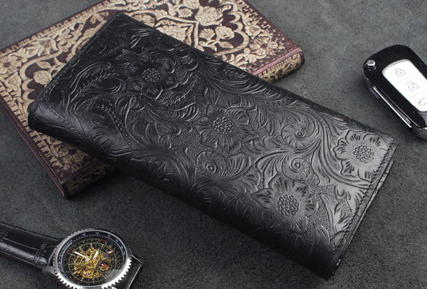 Design: Handmade long leather wallet trifold flowral leather clutch wallet for men women