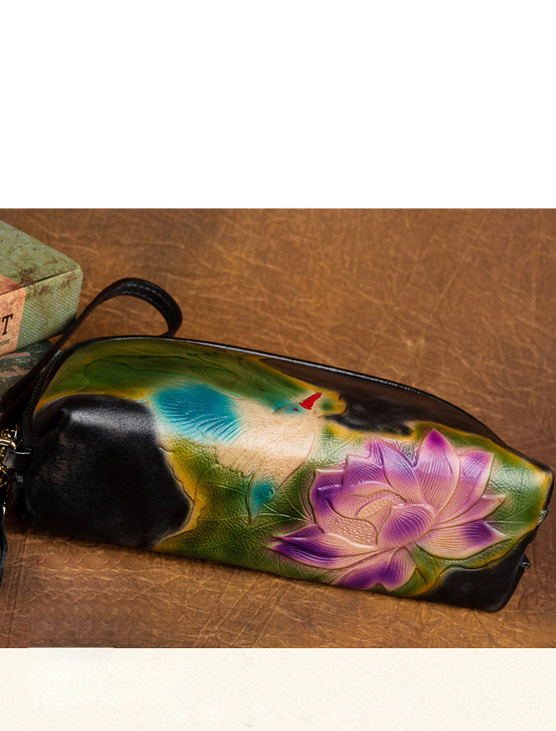 Style: Handmade Lotus Flower Leather Wristlet Wallet Womens Zip Around Wallets Flowers Ladies Zipper Clutch Wallet for Women