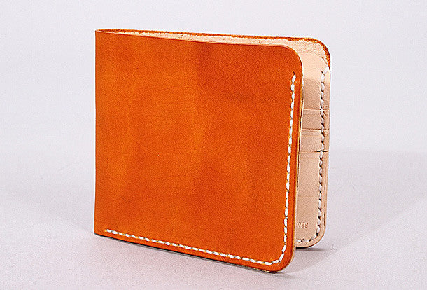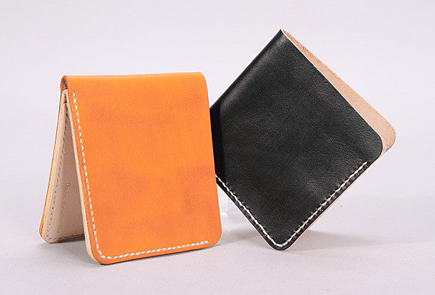 This is handcraft handmade vintage orange?black modern slim natural Italian Vegetable Tanned leather?billfold? wallet for men.The wallet is bifold,color is orange ,black.There are 1?full size bill slot/holder,4 ID/credit card slots/holders~Hand-made in the traditional method with punched holes and saddle stitching by hand.