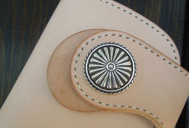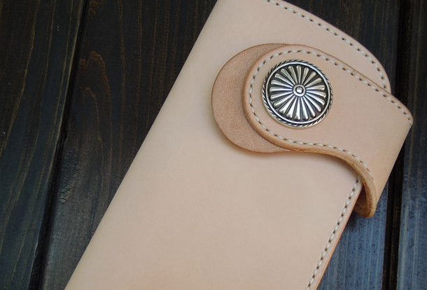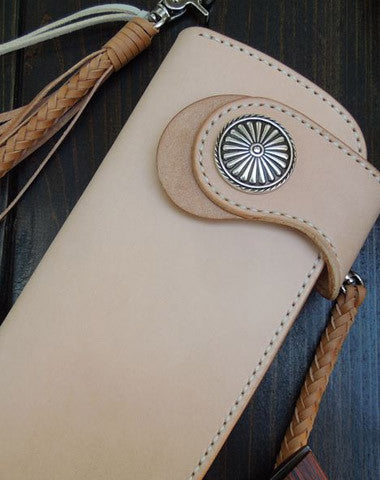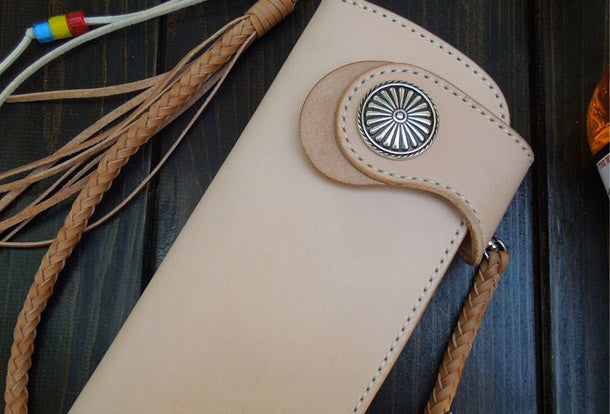 This is handmade leather beige natural Italian Vegetable Tanned leather long biker wallet chain for men/women.The wallet is bifold,color is beige.There are 2 full size bill slots/holders, 6 ID/credit card slots/holders, 1 zip coin slot/holder,and a vintage floral?button?as its lock catch~Hand-made in the traditional method with punched holes and saddle stitching by hand.