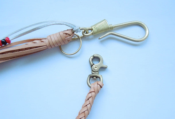 This is handmade natural Italian Vegetable Tanned leather?braided Chain with brass hook?Clip for wallet/purse/clutch.The chain is 8pc,color is brown,black ,beige.This chain is about 50 c
