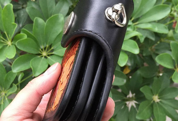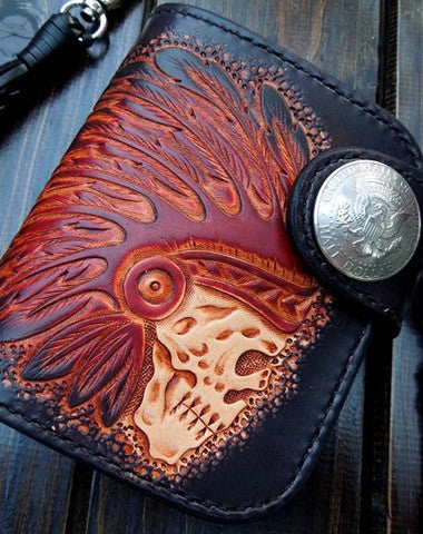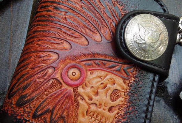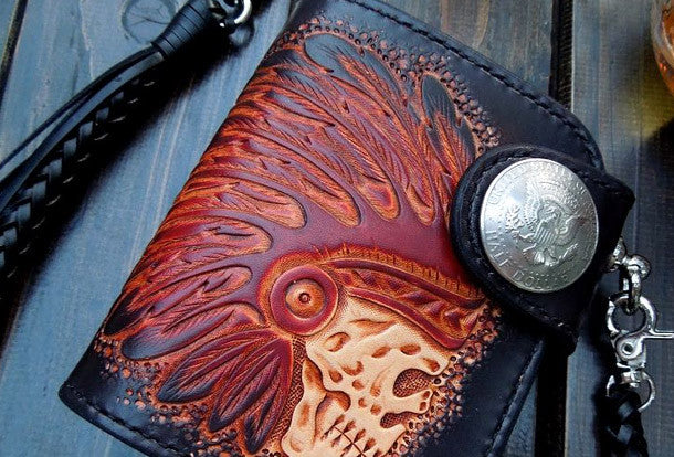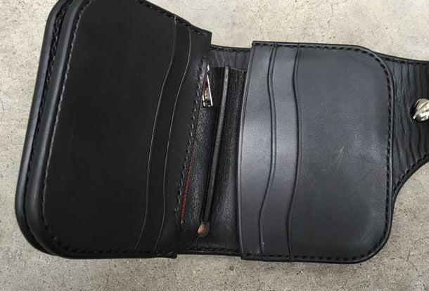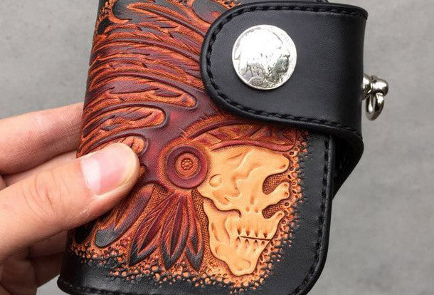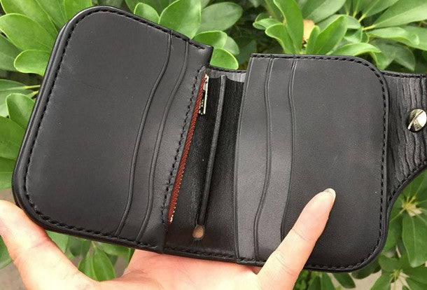 This is Handmade natural leather carved black skull billfold biker wallet trifold purse for men.The wallet is bifold?,color is black.There are 1 full size bill slots/holders,?2 half size bill slots/holders,?6 ID/credit card slots/holders ,and a vintage american icon/floral button as its lock catch~Hand-made in the traditional method with punched holes and saddle stitching by hand.