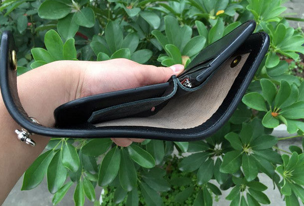 This is Handmade natural leather carved black skull billfold biker wallet trifold purse for men.The wallet is bifold?,color is black.There are 1 full size bill slots/holders,?2 half size bill slots/holders,?6 ID/credit card slots/holders ,and a vintage american icon/floral b