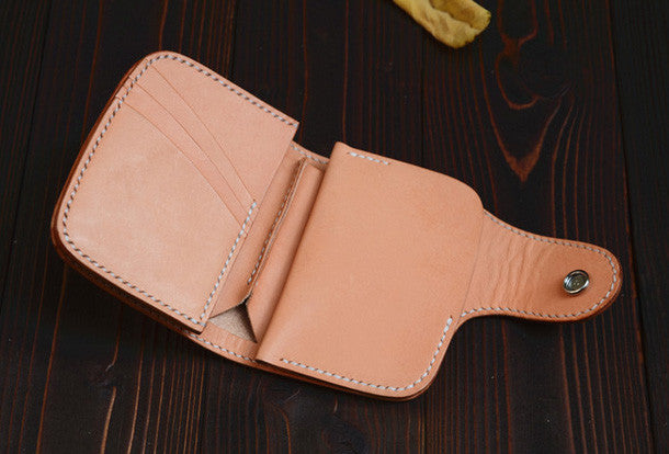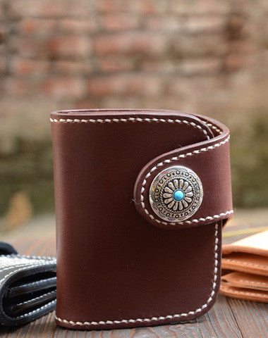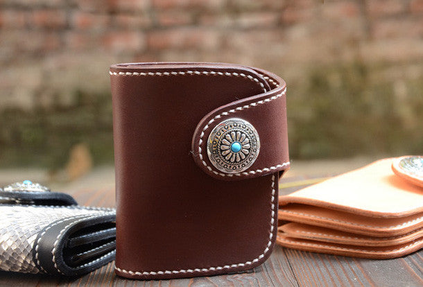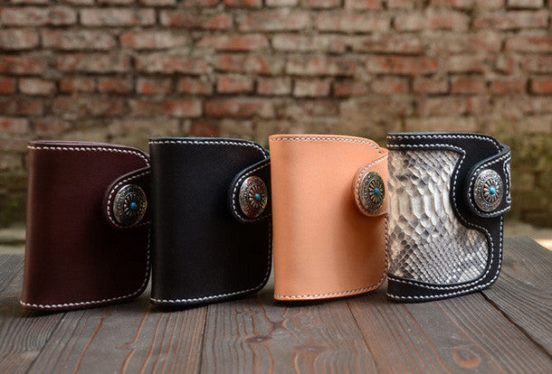 This is handmade beige coffee?black?natural Italian Vegetable Tanned leather? billfold biker wallet chain for men.The wallet is bifold,color is black,beige,coffee.There are 1 full size bill slots/holders, 3?ID/credit card slots/holders, 1 zip coin slot/holder,and a vintage american icon/floral button as its lock catch~Hand-made in the traditional method with punched holes and saddle stitching by hand.