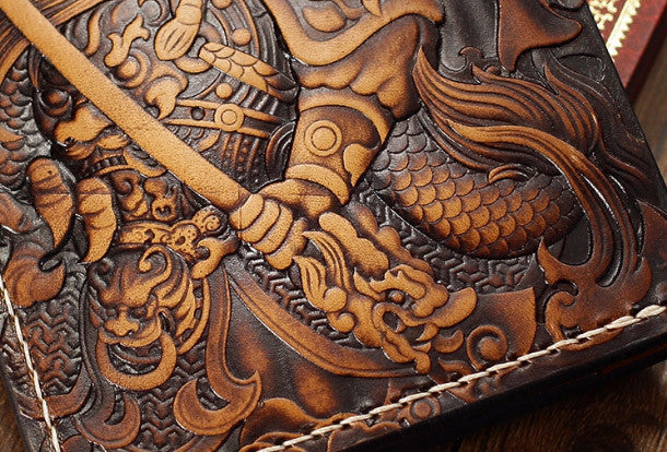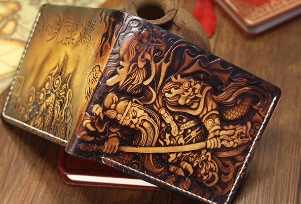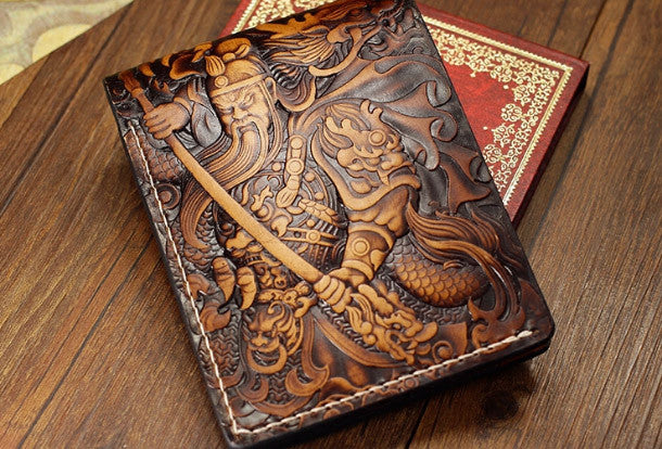 Handmade the-Three-Kingdoms_Guan-Yu carved leather custom billfold wallet for men gamers