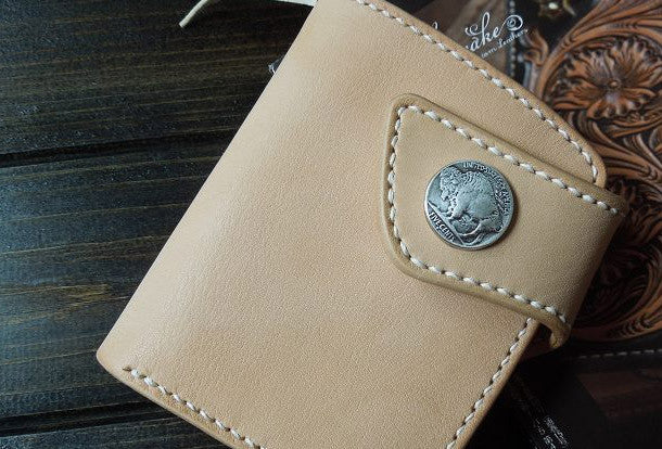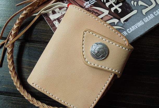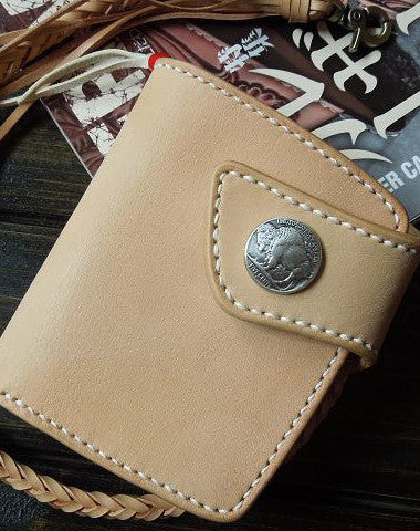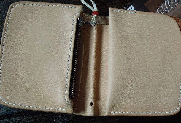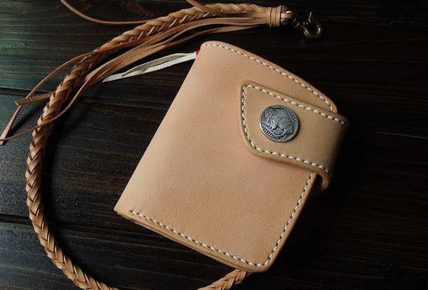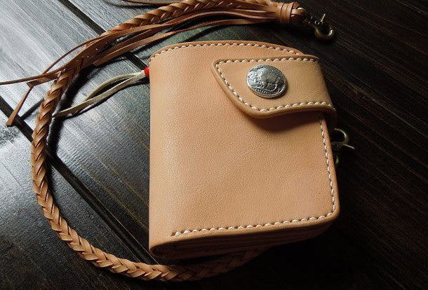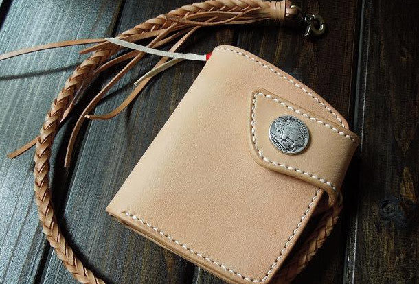 This is Handmade natural leather biker wallet chain bifold beige billfold wallet for men.The wallet is bifold,color is beige.There are 1 full size bill slots/holders, 1?big ID/credit card slot/holder, 1 zip coin slot/holder ,and a vintage american icon/floral button as its lock catch~Hand-made in the traditional method with punched holes and saddle stitching by hand.