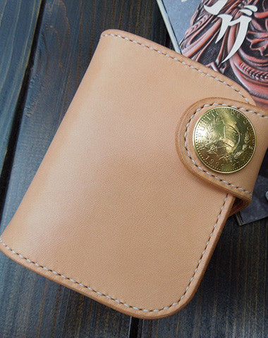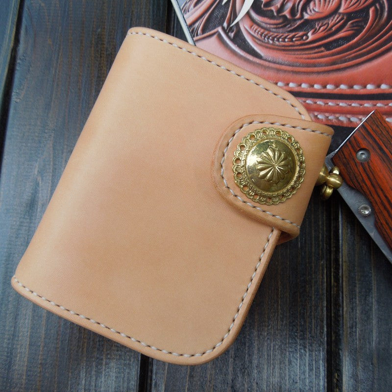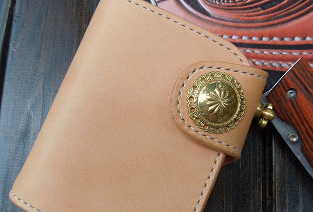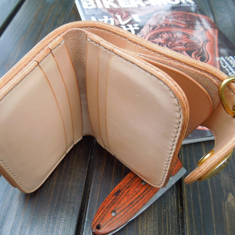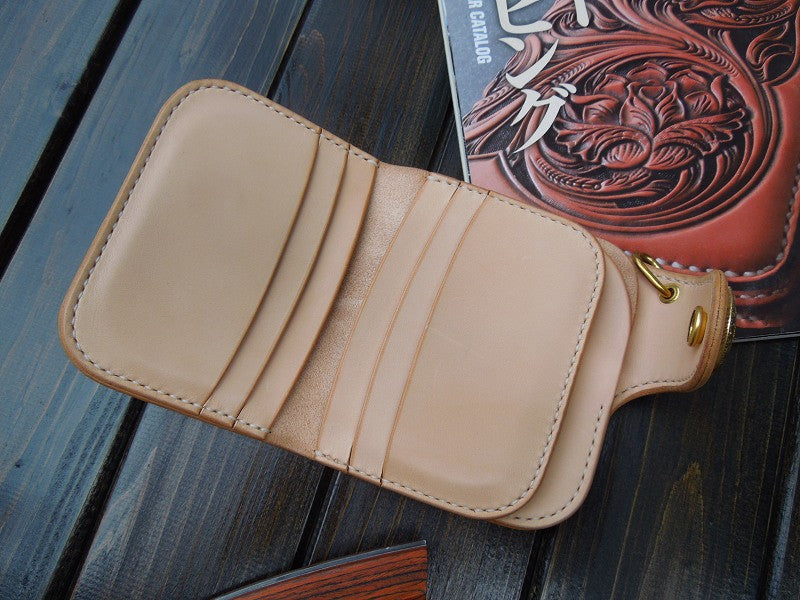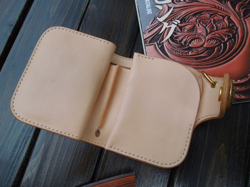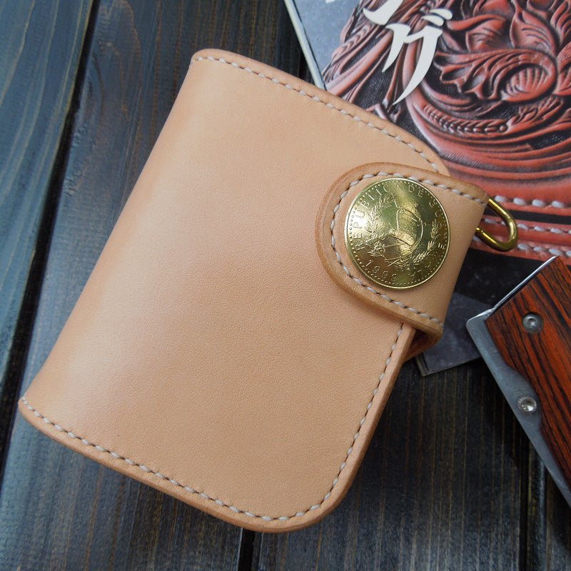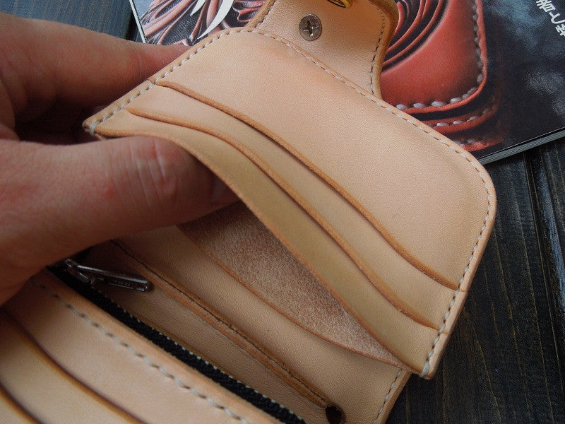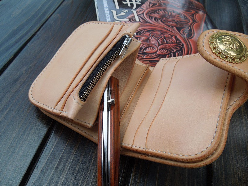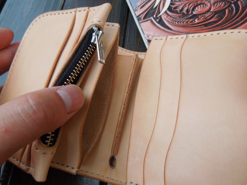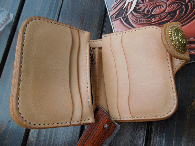 This is handmade natural Italian Vegetable Tanned leather? billfold biker wallet for men/women.The wallet is trifold,color is beige.There are 1 full size bill slots/holders, 8 ID/credit card slots/holders, 1 zip coin slot/holder 3?coin slot/holder,and a vintage american icon/floral button as its lock catch~Hand-made in the traditional method with punched holes and saddle stitching by hand.