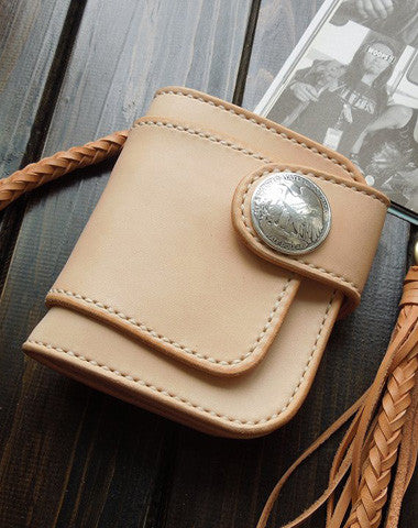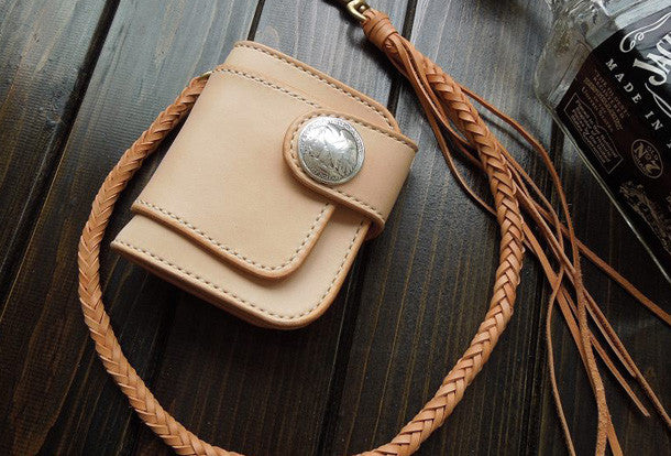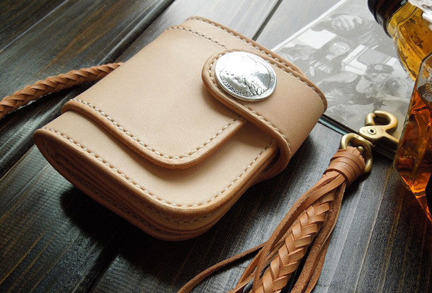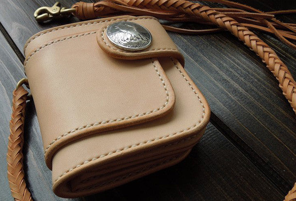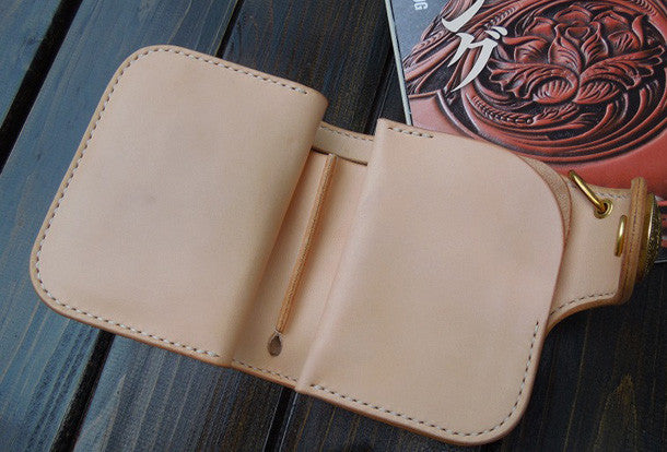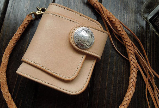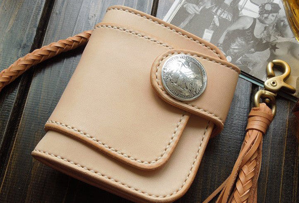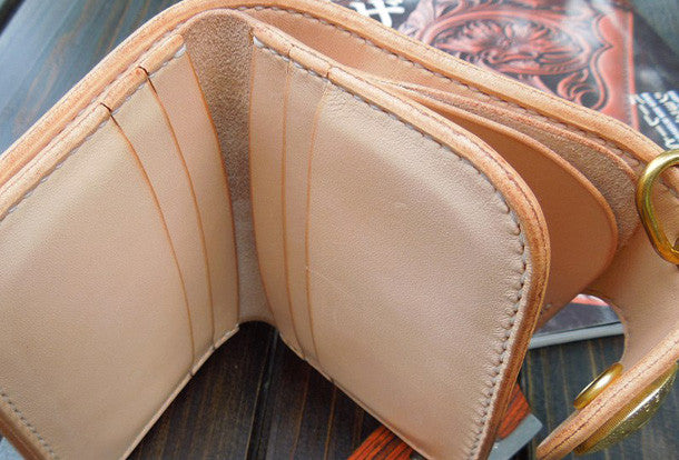 This is handmade natural Italian Vegetable Tanned leather? billfold biker wallet for men/women.The wallet is trifold,color is beige.There are 1 full size bill slots/holders, 2 half size bill slots/holders,?6 ID/credit card slots/holders,and a vintage american icon/floral button as its lock catch~Hand-made in the traditional method with punched holes and saddle stitching by hand.