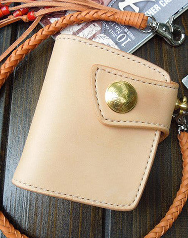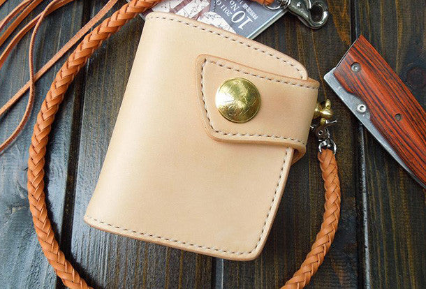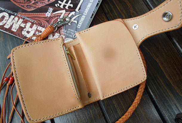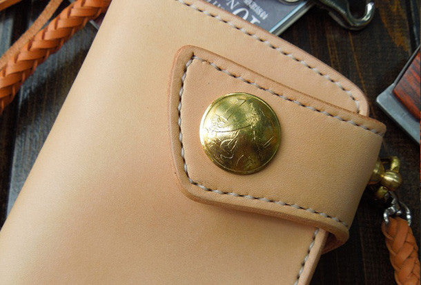 This is handmade natural?Italian Vegetable Tanned leather?billfold biker wallet for men/women.The wallet is trifold?,color is beige.There are 1 full size bill slots/holders, 3 big ID/credit card slots/holders, 1 big zip coin slot/holder ,and a vintage american icon/floral button as its lock catch~Hand-made in the traditional method with punched holes and saddle stitching by hand.