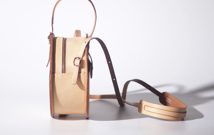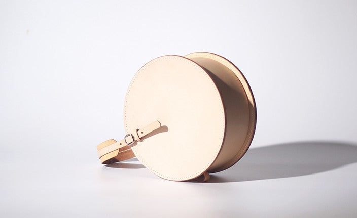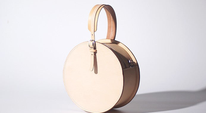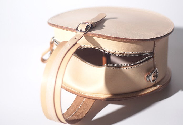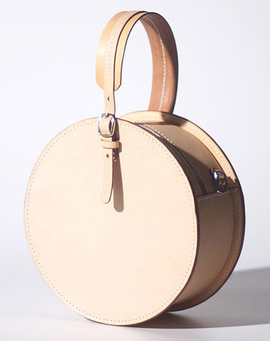 Style: Handmade Womens Beige Leather Circle Handbag Round Purse Crossbody Bag for Women