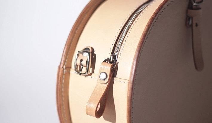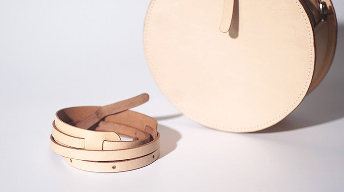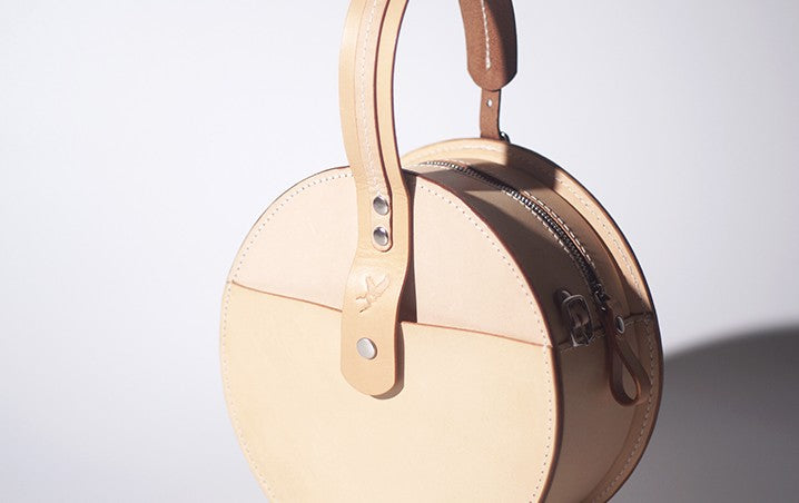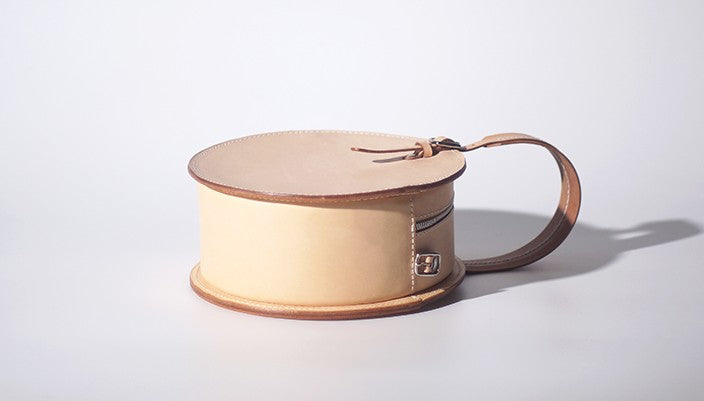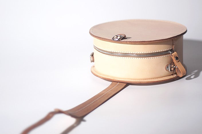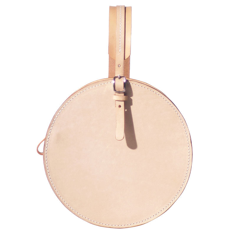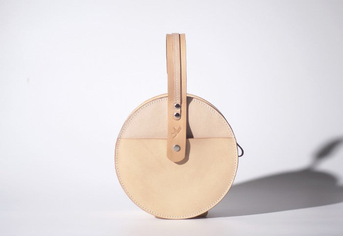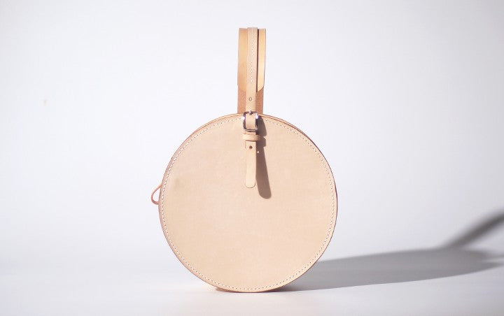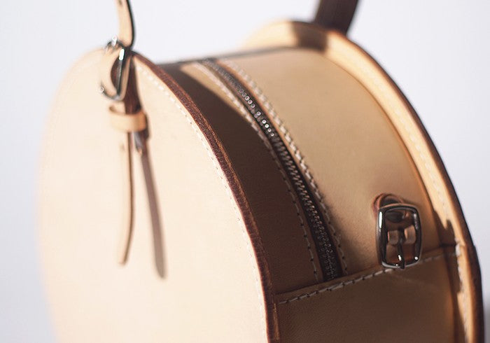 Design: Handmade Womens Beige Leather Circle Handbag Round Purse Crossbody Bag for Women