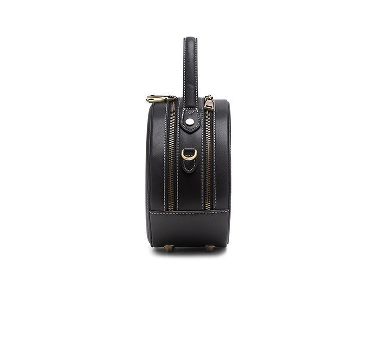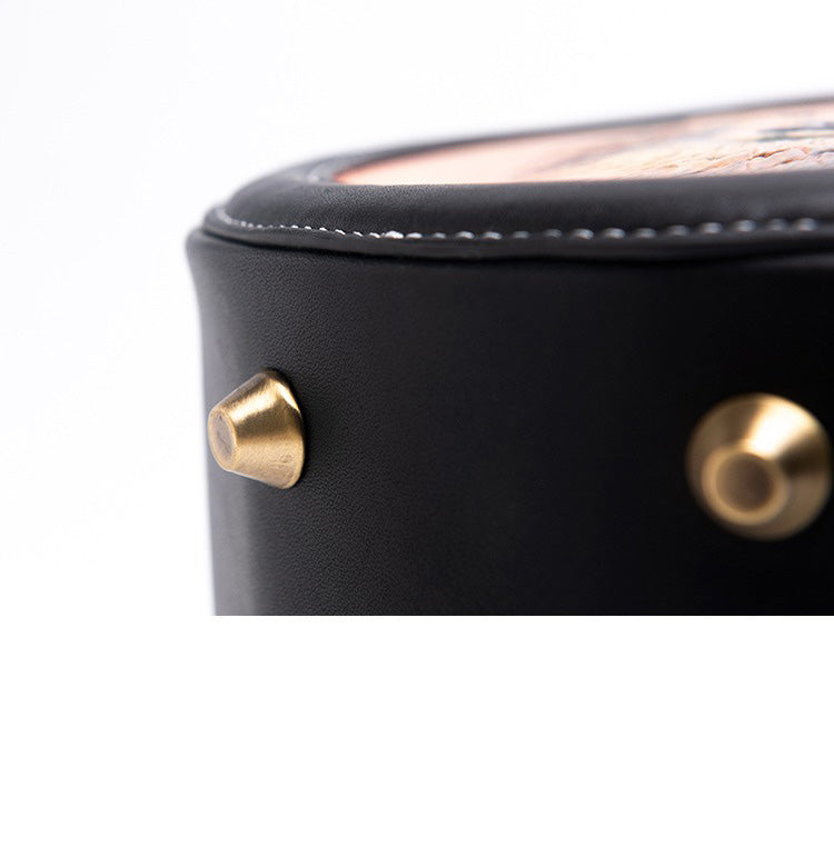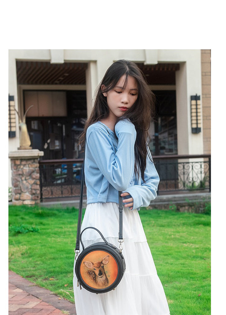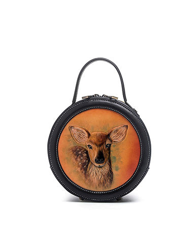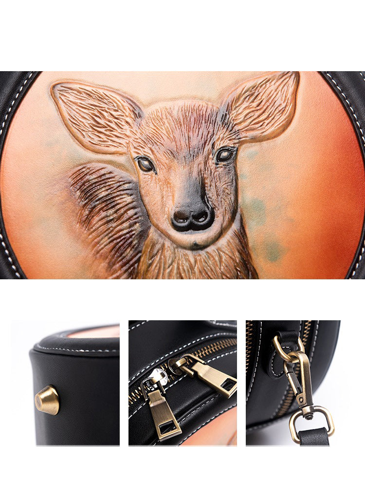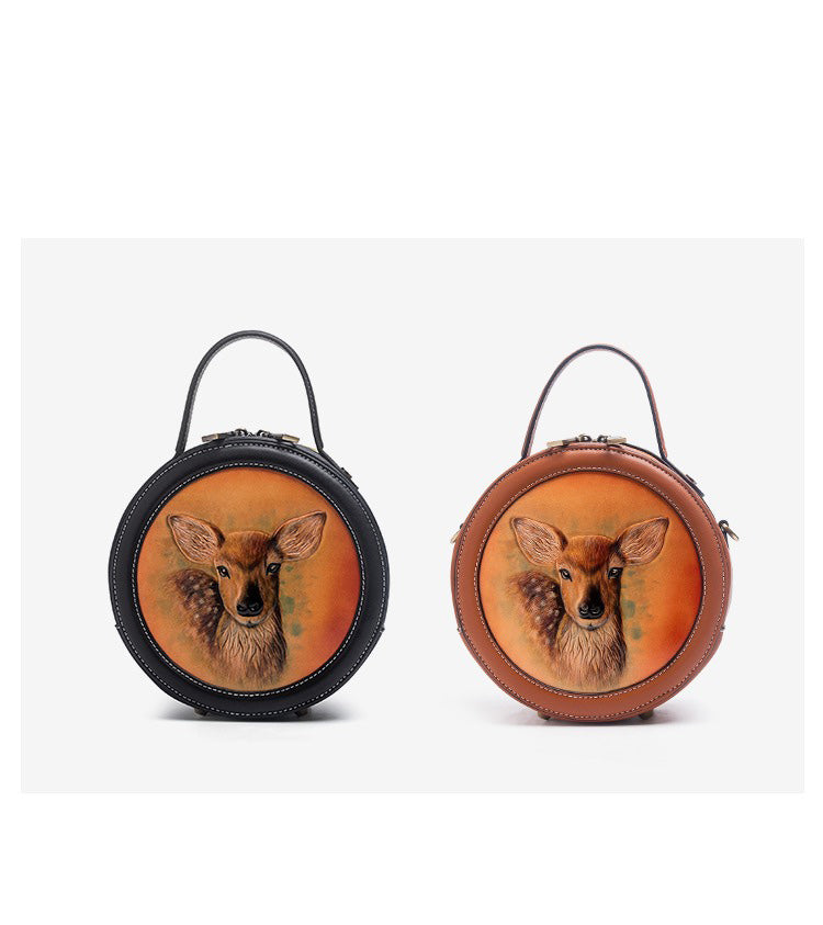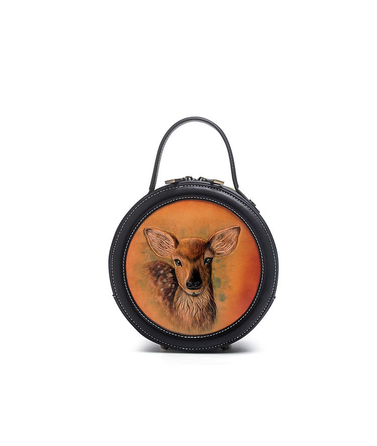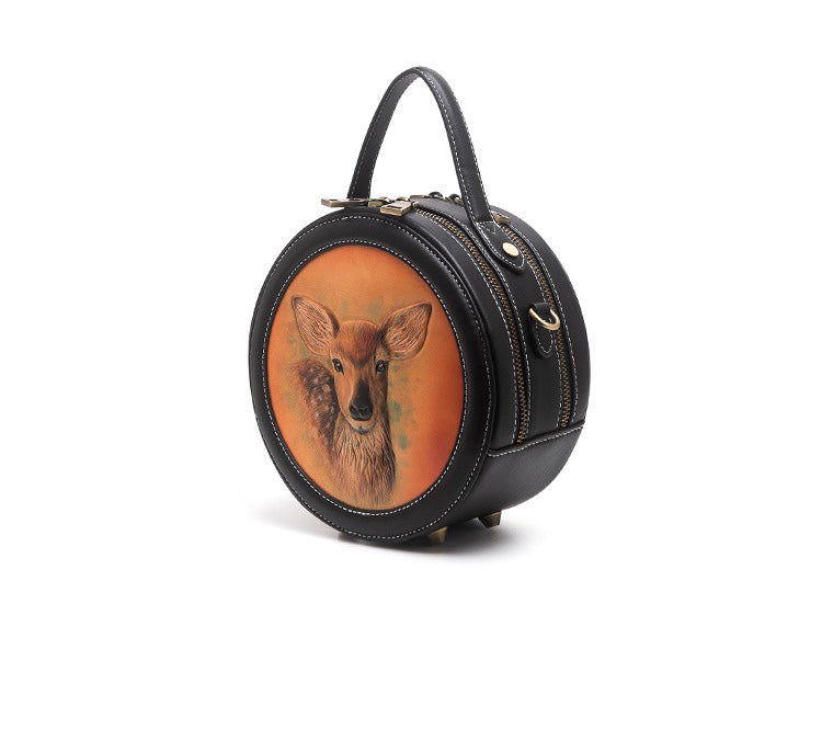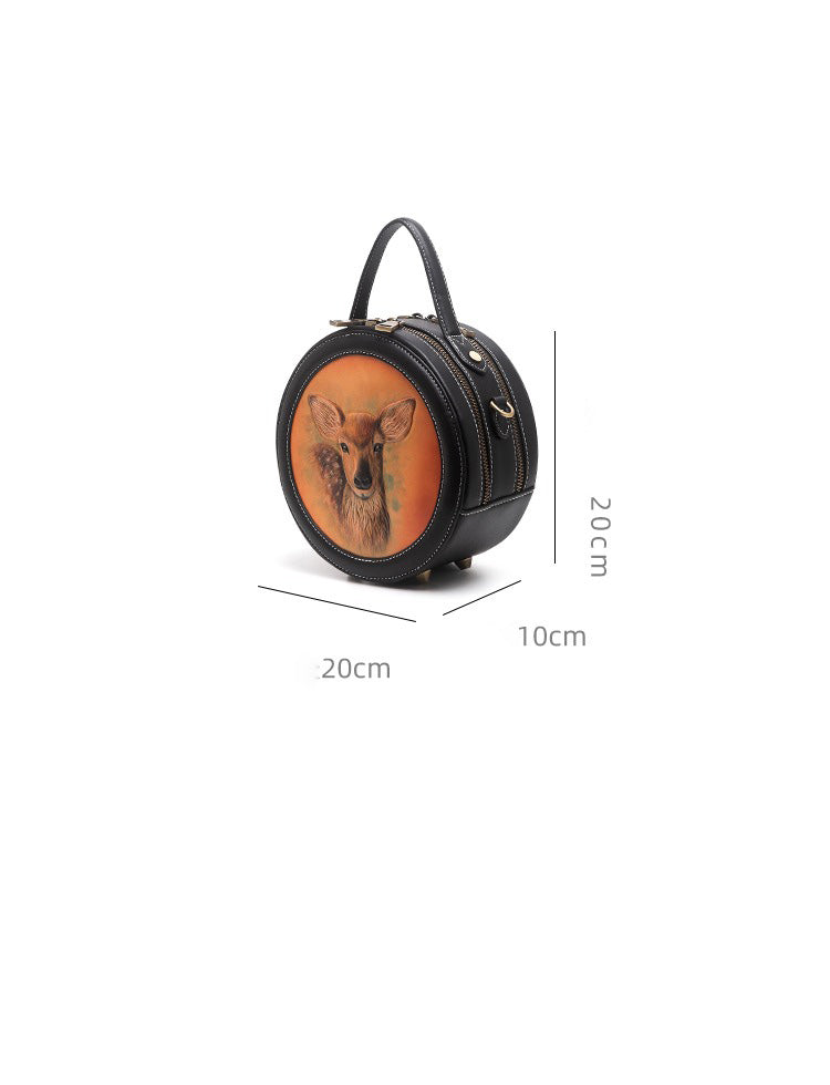 Design: Handmade Womens Black Leather Round Handbag Purse Round Deer Crossbody Bag for Women