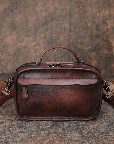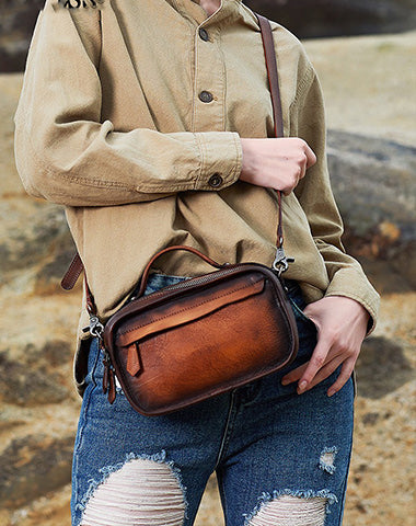 Handmade Womens Brown Leather Mini Satchel Shoulder Bag Best Handbag Cube Crossbody Purses for Ladies