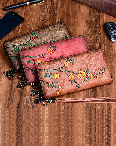 Design: Handmade Womens Leather Plum Blossom Flowers Wristlet Wallet Zip Around Wallet Ladies Zipper Clutch Wallet for Women
