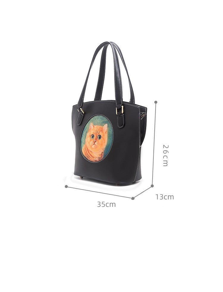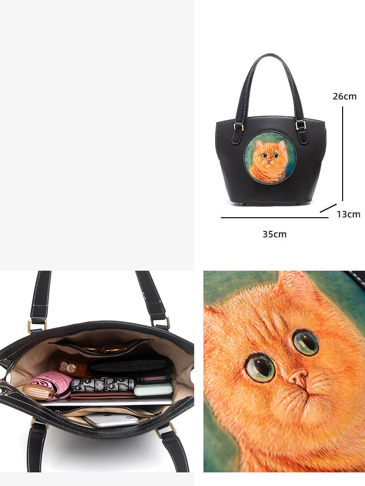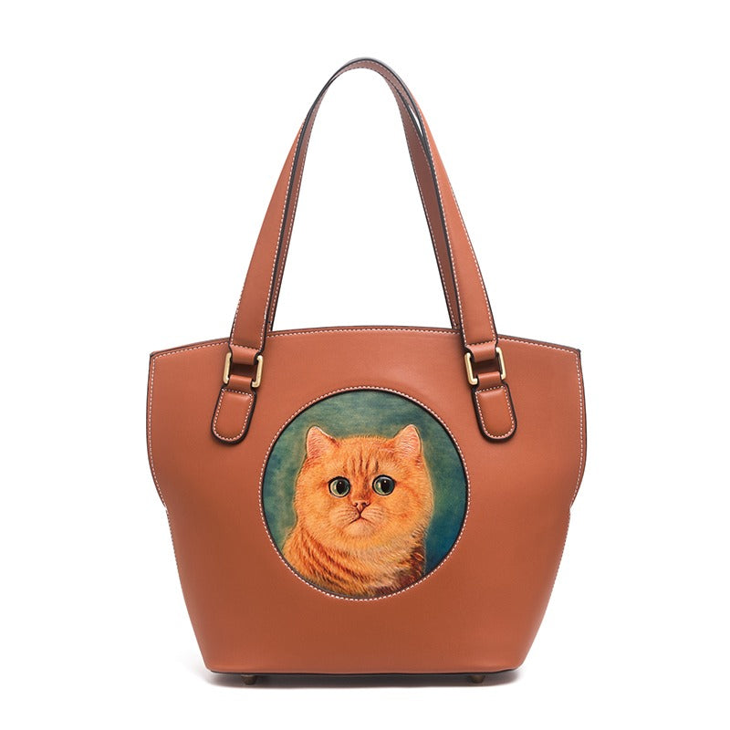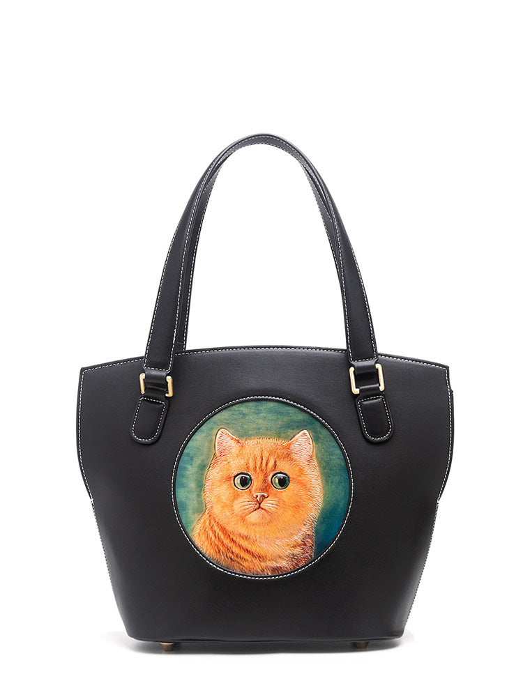 Style: Handmade Womens Brown Leather Tote Handbag Purse Black Cat Tote Bag for Women