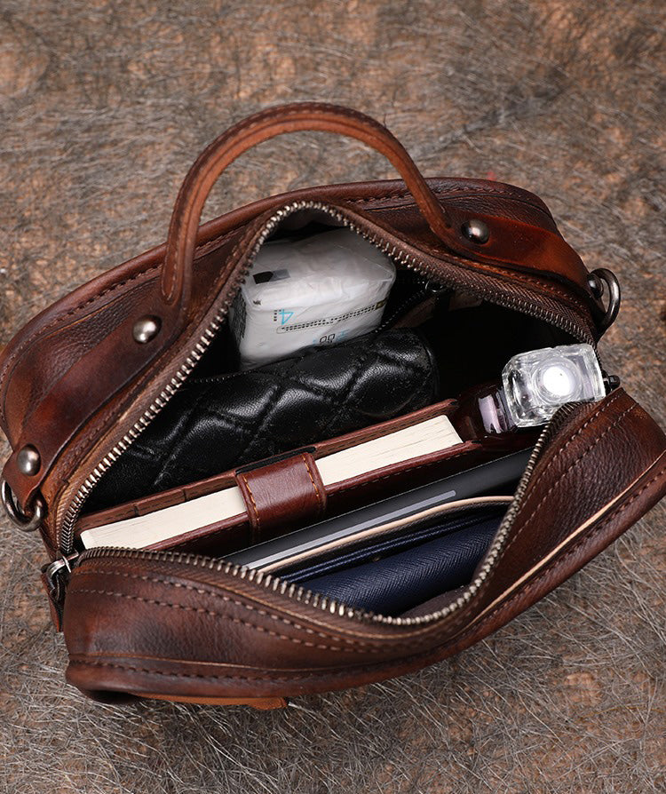Handmade Womens Coffee Leather Mini Satchel Shoulder Bag Best Handbag Cube Crossbody Purses for Ladies