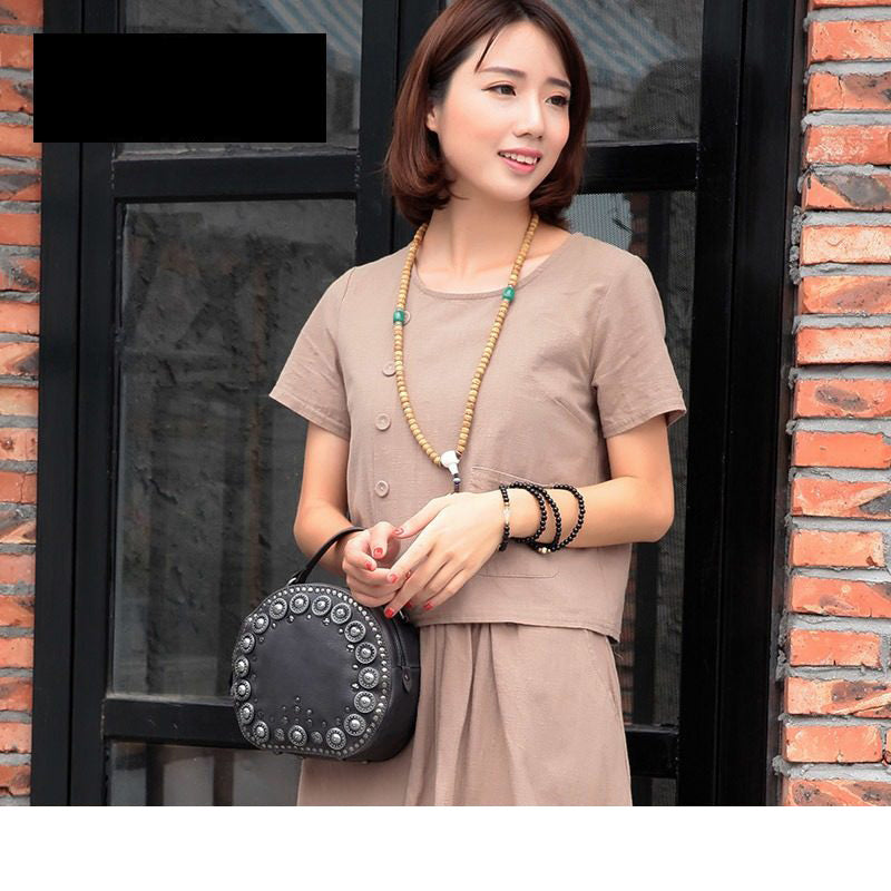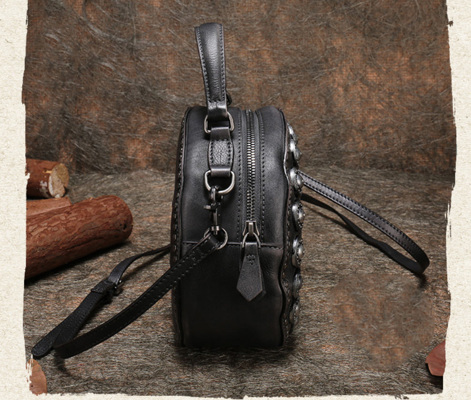 Design: Handmade Womens Gray Leather Round Handbag Purses Rivet Round Shoulder Bag Crossbody Handbag for Women