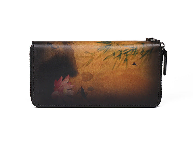 Handmade Womens Leather Zip Around Wallet Wash Painting Flowers Wristlet Wallet Ladies Zipper Clutch Wallet for Women