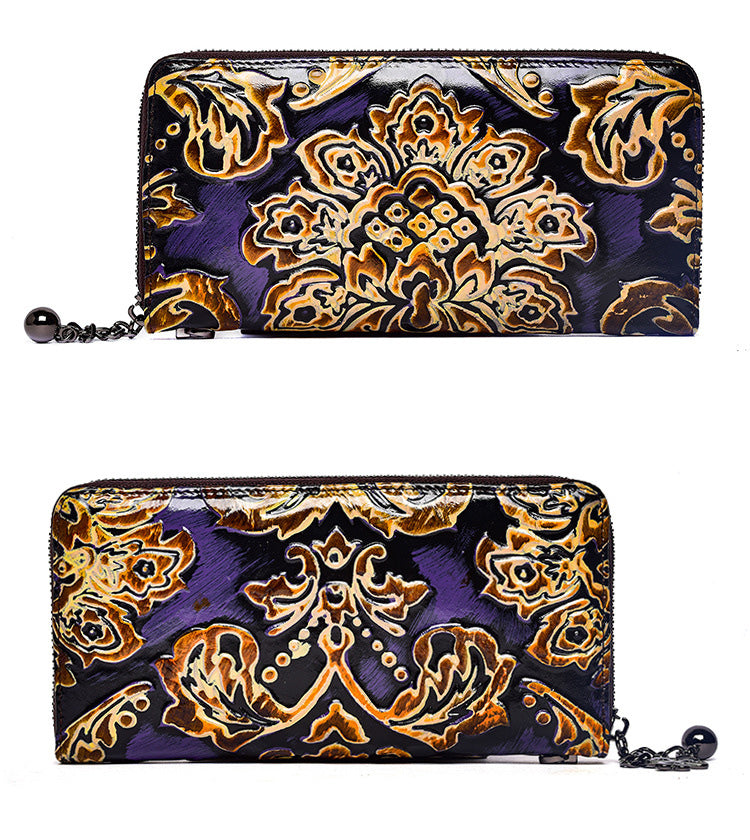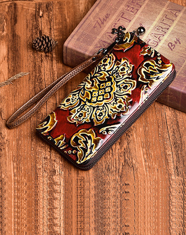 Style: Handmade Womens Sunflower Red Leather Zip Around Wallet Wristlet Wallet Floral Ladies Zipper Clutch Wallet for Women