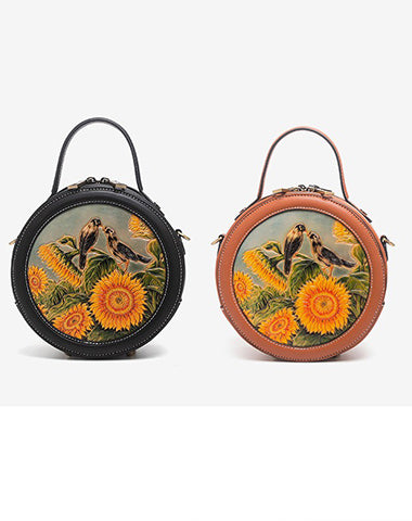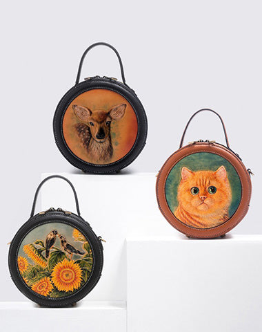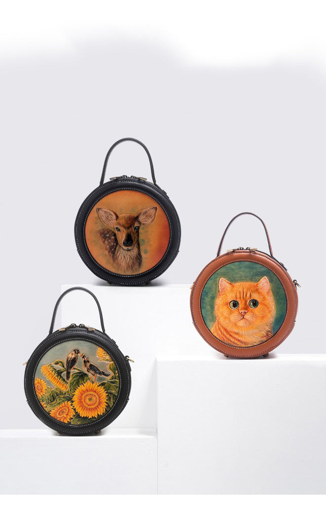 Style: Handmade Womens Black Leather Round Handbag Purse Round Dog Crossbody Bag for Women