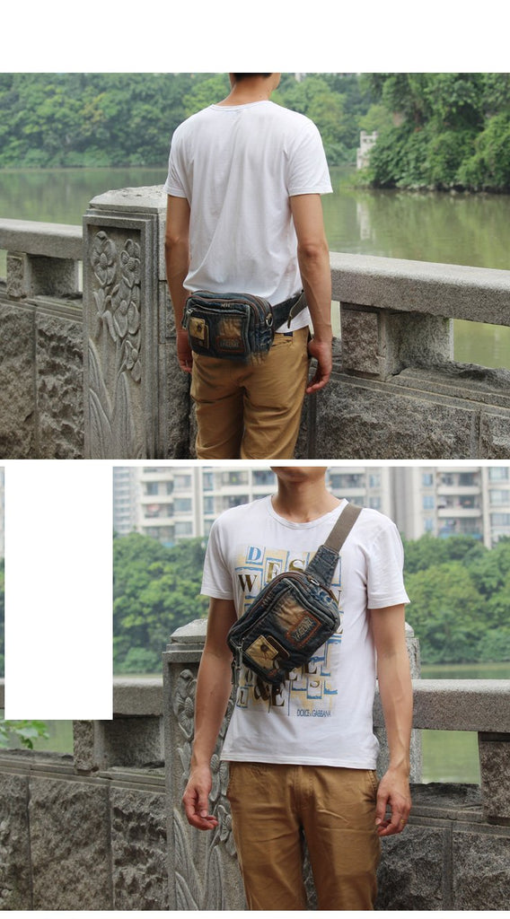 Style: Jean Denim Blue Mens Small Sling Bag Chest Bag Jean One Shoulder Backpacks For Men