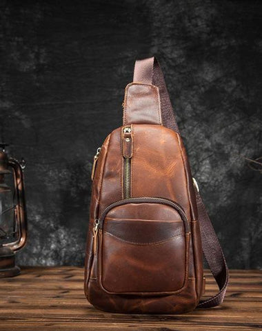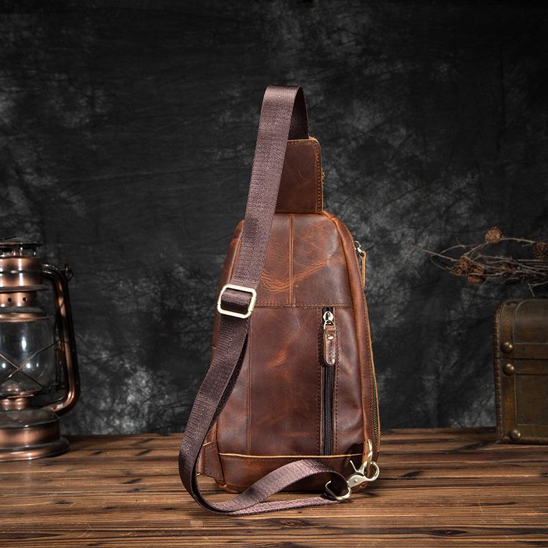 Design: Cool Brown Leather Men's Sling Bag Chest Bag Vintage One Shoulder Backpack For Men