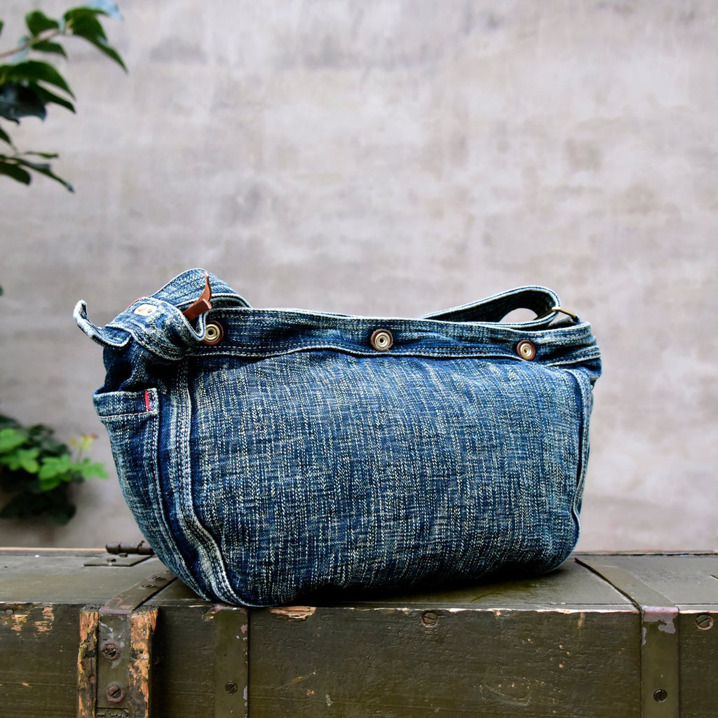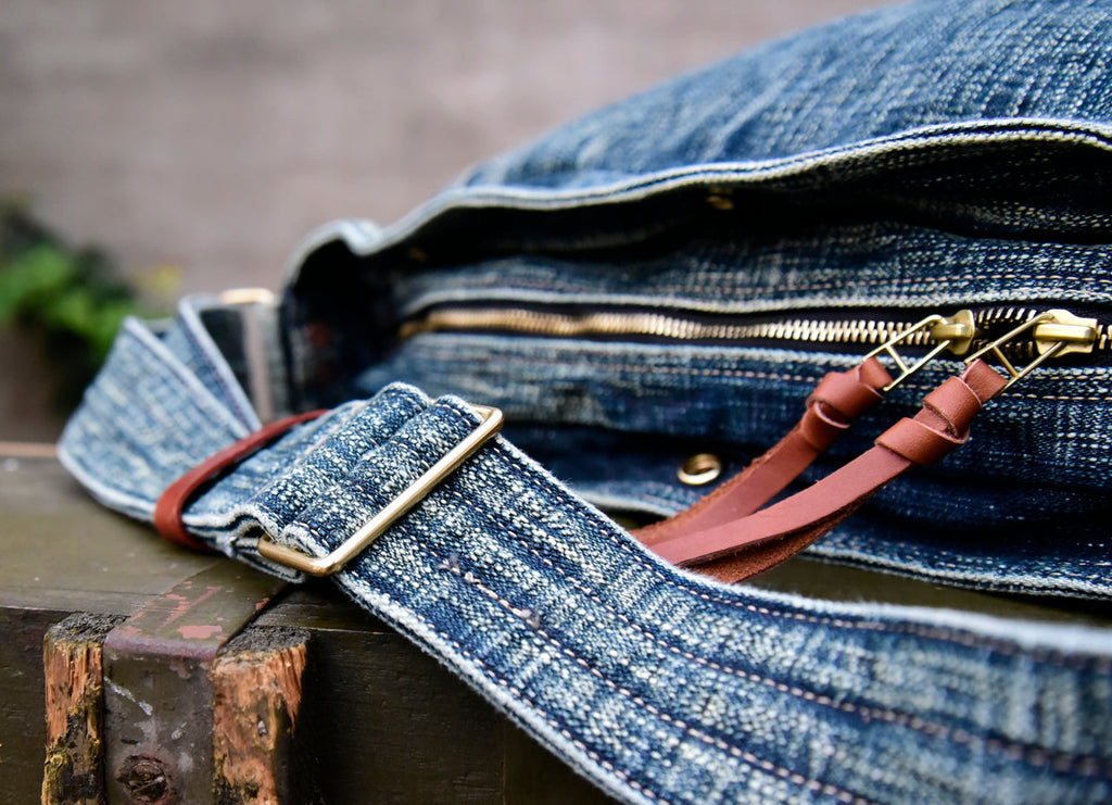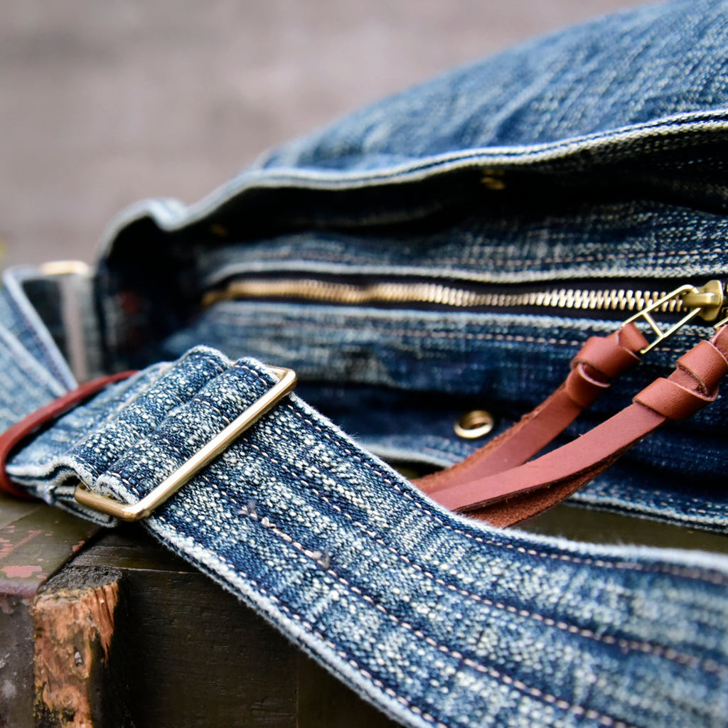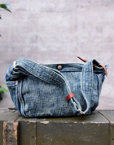 Design: Large Denim Crossbody Bag for Men Washed Distressed Large Jeans Shoulder Bag Blue Denim Messenger Bag
