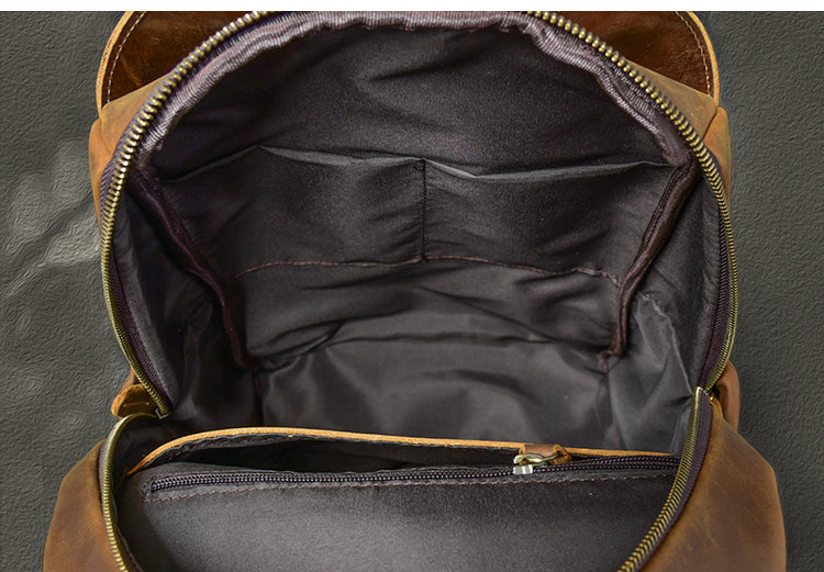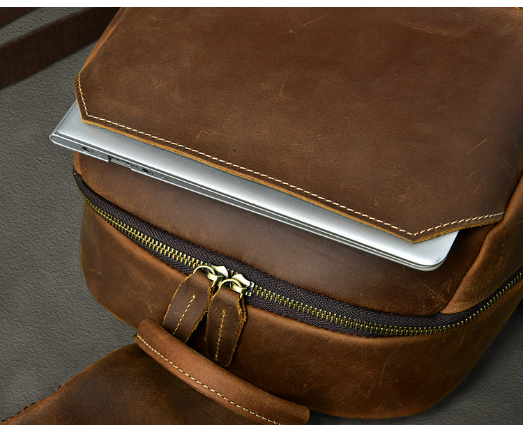 The large leather men's sling bag features a thoughtfully organized layout to keep your belongings secure and easily accessible. The main compartment, secured with a zipper, is spacious enough to hold all your essentials, whether you're heading to work, school, or a weekend getaway. Within this main slot, there's a dedicated laptop slot that ensures your device stays protected and in place, making it an ideal choice for professionals and students alike.