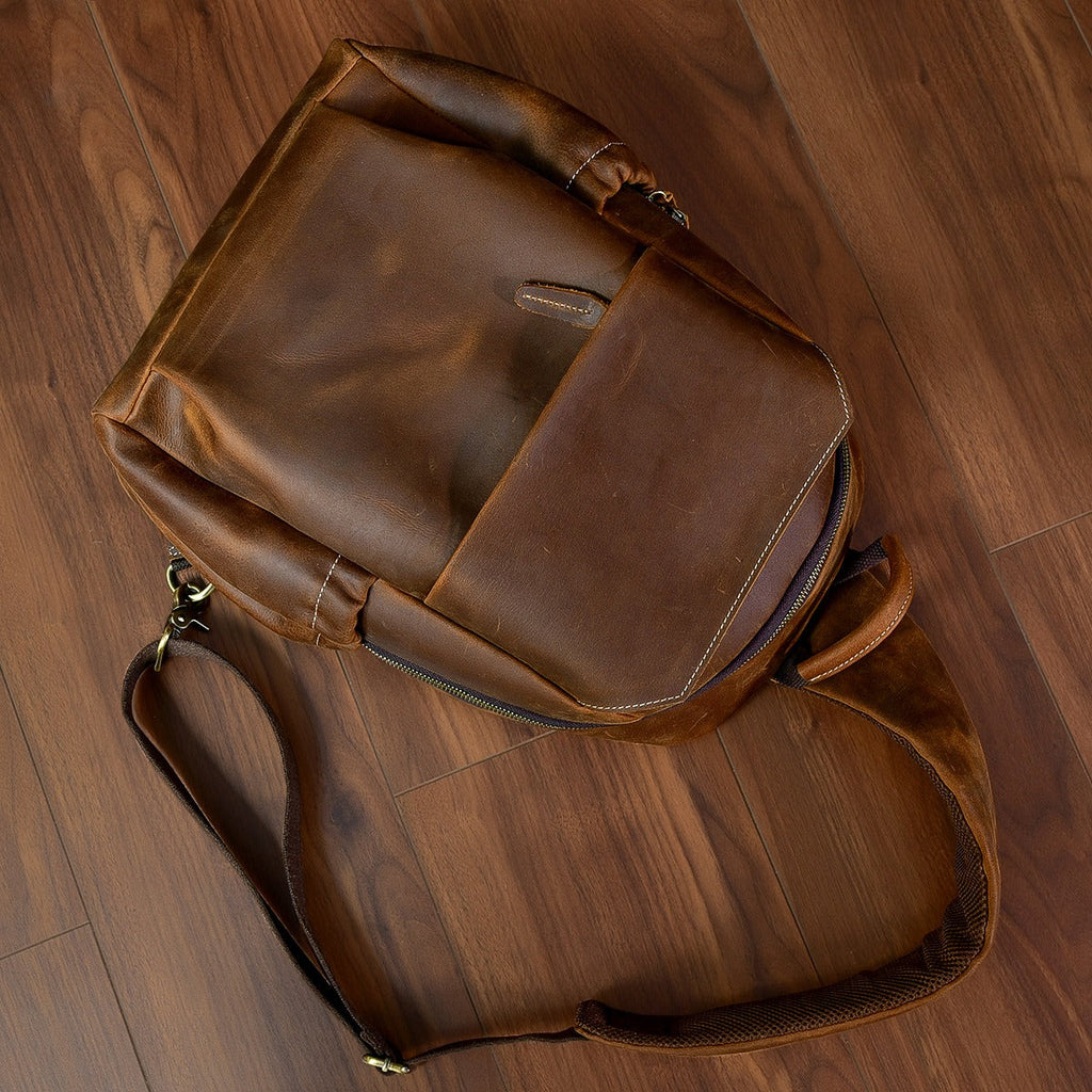 The large leather men's sling bag features a thoughtfully organized layout to keep your belongings secure and easily accessible. The main compartment, secured with a zipper, is spacious enough to hold all your essentials, whether you're heading to work, school, or a weekend getaway. Within this main slot, there's a dedicated laptop slot that ensures your device stays protected and in place, making it an ideal choice for professionals and students alike.