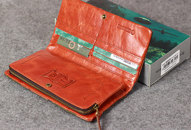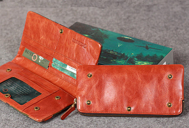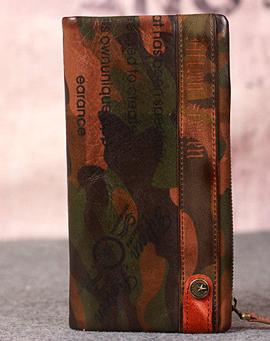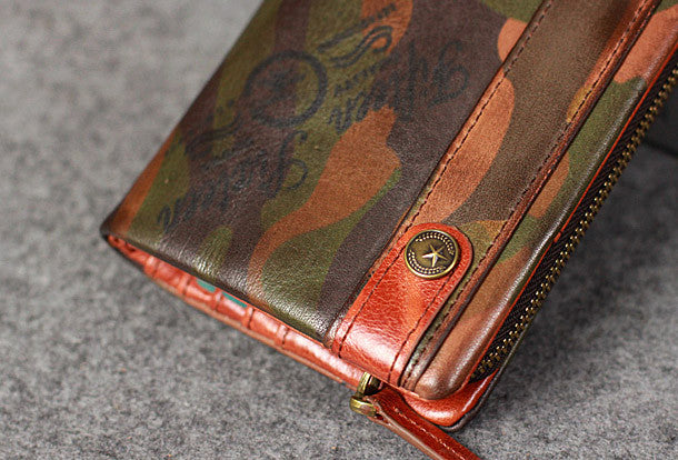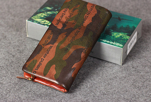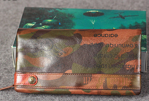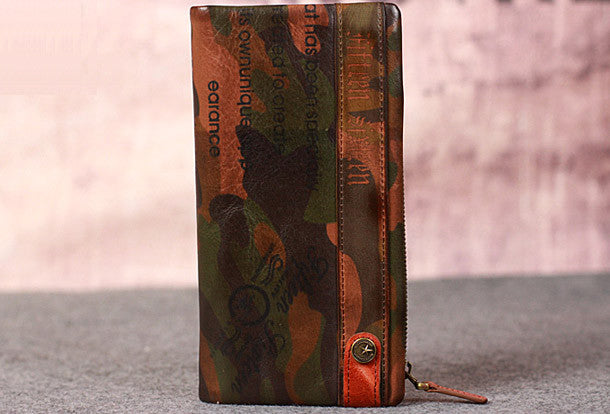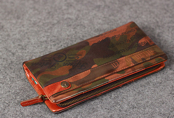 This is Leather camouflage men clutch long wallet vintage clutch long wallet purse clutch.The wallet is bifold,color is?camouflage .There are 2?full size bill slots/holders,9 ID/credit card slots/holders,2?ID?holder,1 photo?holder.