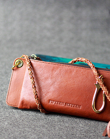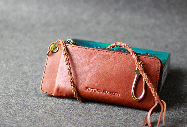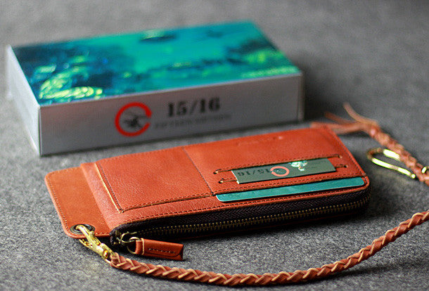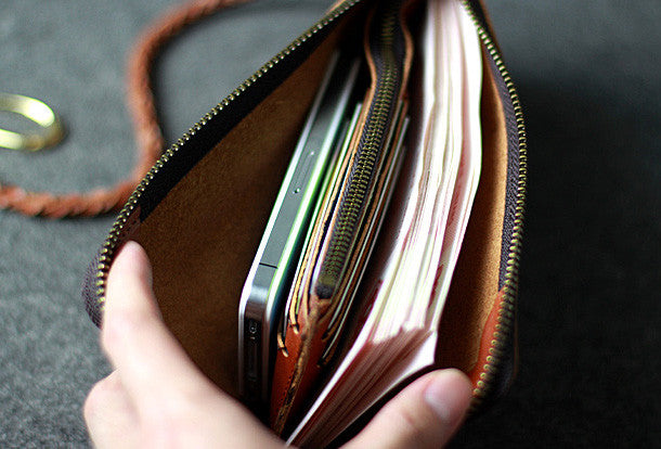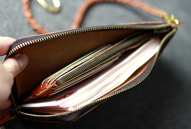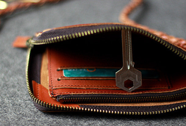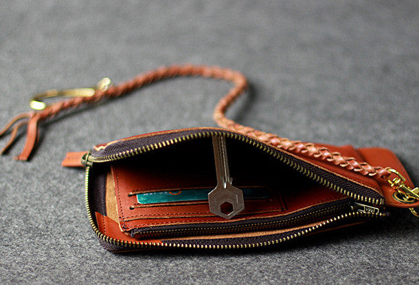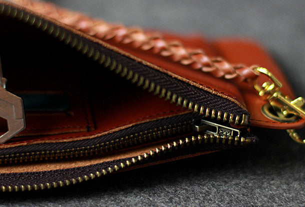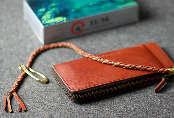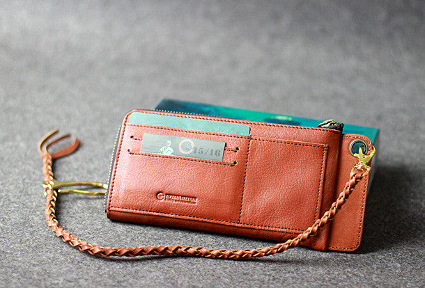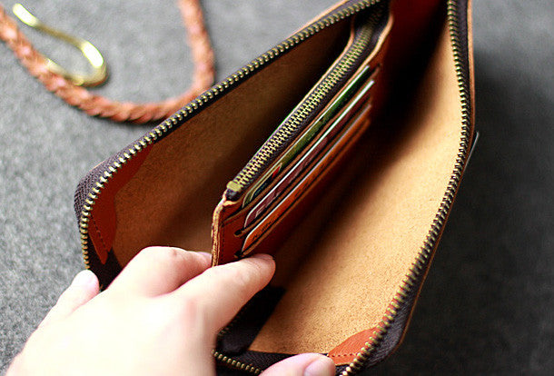 This is leather men clutch brown?vintage modern chain fashion zip clutch men long wallet purse clutch.The wallet is bifold,color is brown?.There are 2?full size bill slots/holders, 9 ID/credit card slots/holders,1?zip?holder.