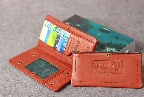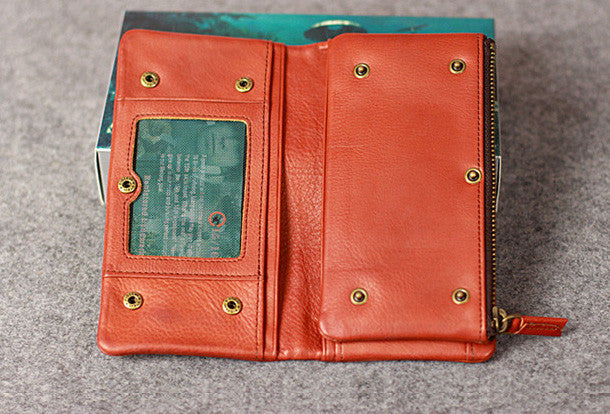 This is leather men clutch brown?vintage modern fashion zip clutch men long wallet purse clutch.The wallet is bifold,color is brown?.There are 4?full size bill slots/holders,8?ID/credit card slots/holders,1?zip?holder,1 photo holder.
