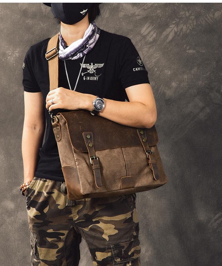 Design: Leather Mens Womens 14" Large Shoulder Bag Green Tote Bag Large Side Bag Brown Messenger Bag For Men