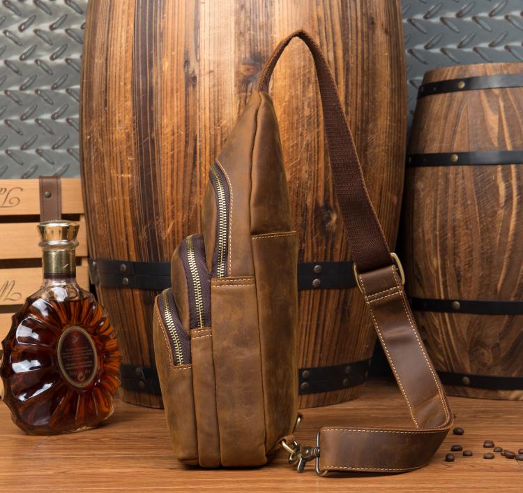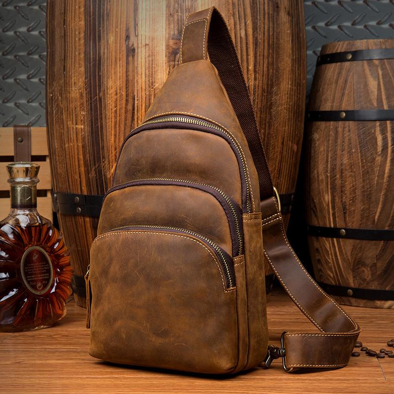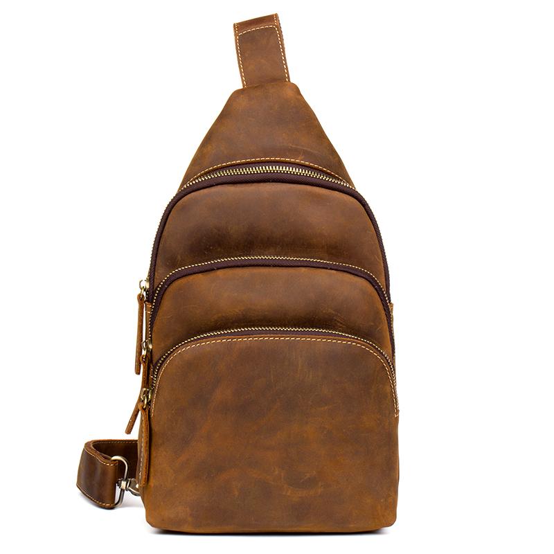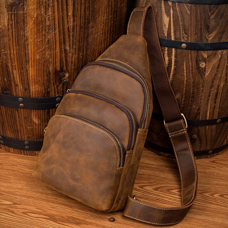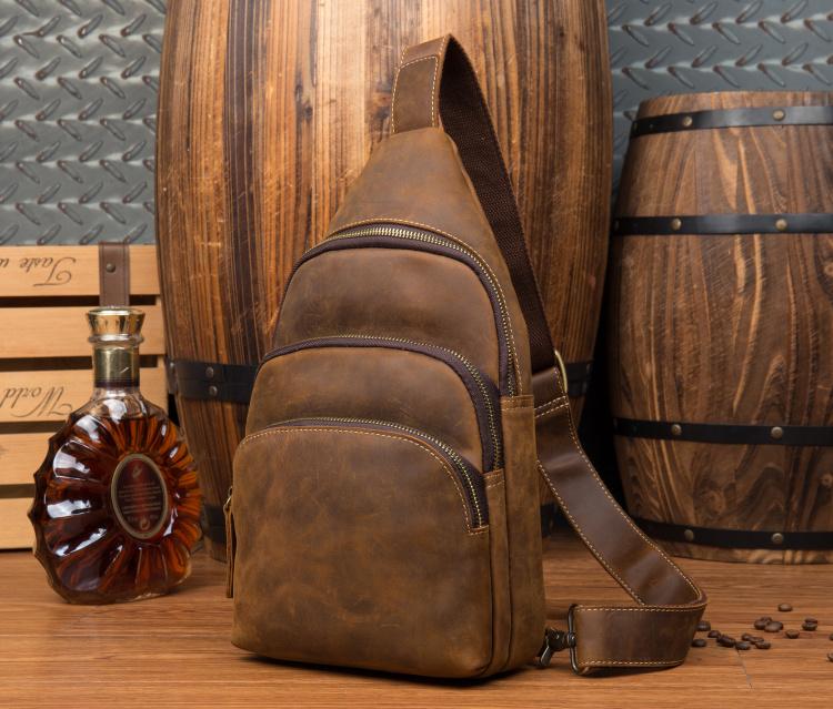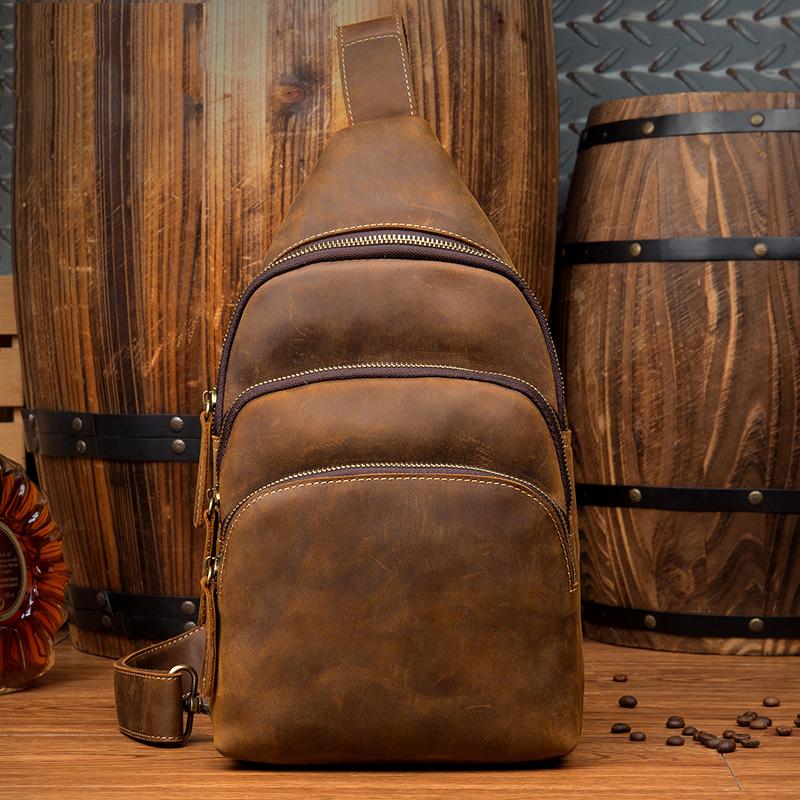 Design: Light Brown Casual Leather Mens 8 inches Sling Bag Chest Bag One Shoulder Backpack for Men