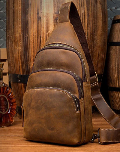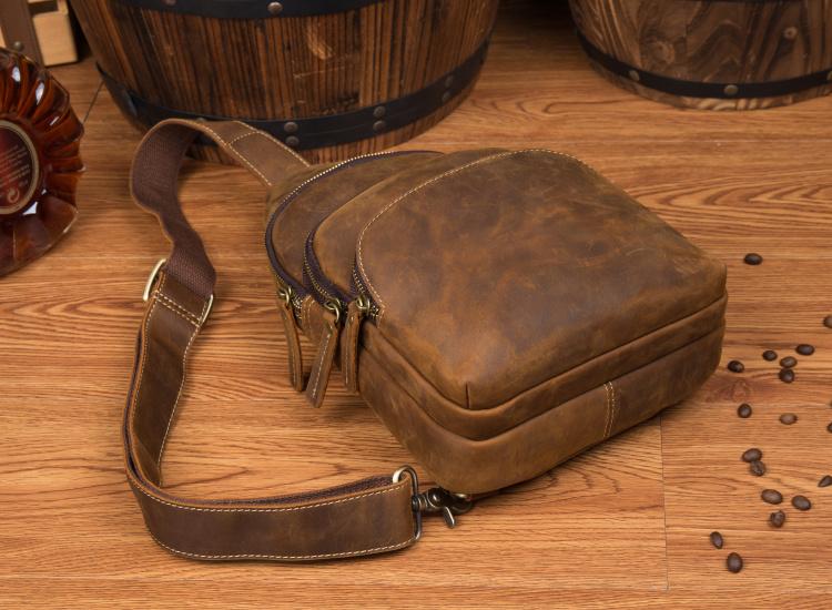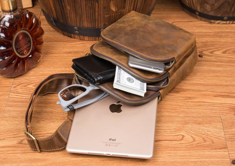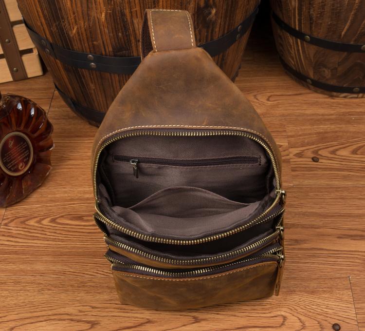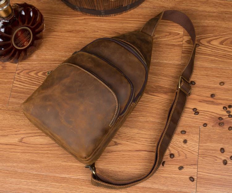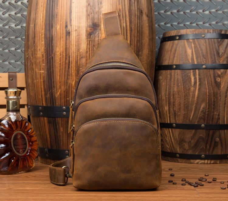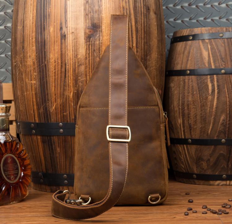 Design: Light Brown Casual Leather Mens 8 inches Sling Bag Chest Bag One Shoulder Backpack for Men