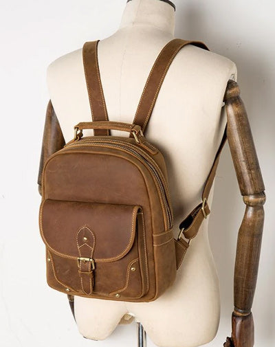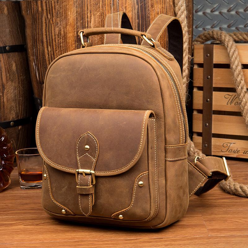Design: Light Brown Fashion Mens Leather 12-inch Computer Backpacks Cool Travel Backpacks School Backpack for men