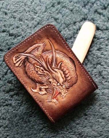 Design: Chinese Dragon ID Holder Wallet Mens Wallet with ID Window Loong Tooled Leather Wallet Card Wallet with ID Window