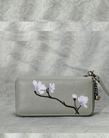 Style: Magnolia Flower Embroidery Blue Leather Magnolia Wristlet Wallet Womens Zip Around Wallets Flowers Magnolia Ladies Zipper Clutch Wallet for Women