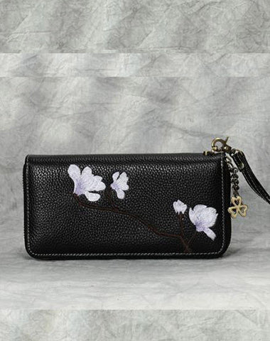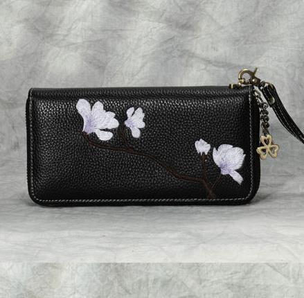 Style: Magnolia Flower Embroidery Gray Leather Magnolia Wristlet Wallet Womens Zip Around Wallets Flowers Magnolia Ladies Zipper Clutch Wallet for Women