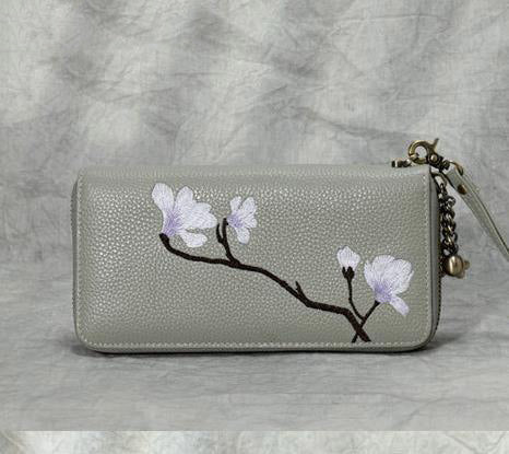 Design: Magnolia Flower Embroidery Gray Leather Magnolia Wristlet Wallet Womens Zip Around Wallets Flowers Magnolia Ladies Zipper Clutch Wallet for Women