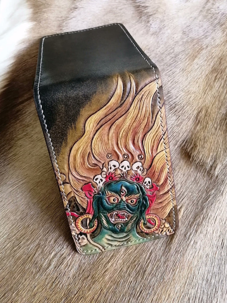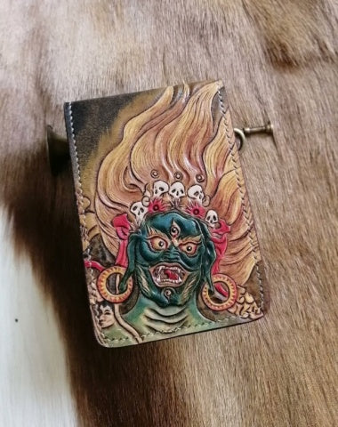 Style: Mahakala Wallet Tooled Leather Wallet Card Wallet with ID Window Mahakala Deity Wallet ID Holder Wallet Mens Wallet with ID Window