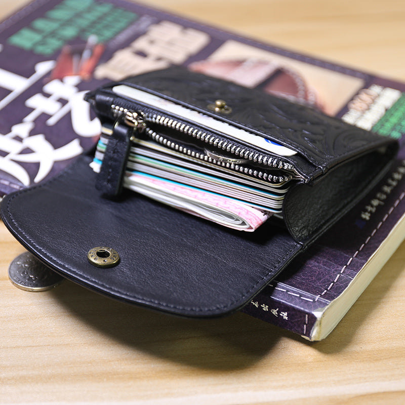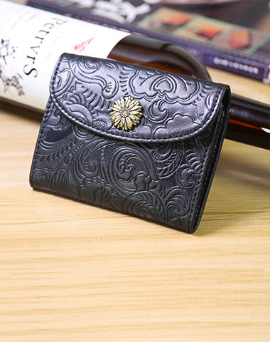 Mini Womens Black Leather Billfold Wallet SunFlower Small Wallet with Coin Pocket Envelope Wallet for Ladies