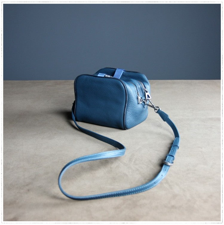 Mini Womens Navy Leather Shoulder Purse Cube Double Zip Leather Crossbody Purse for Ladies