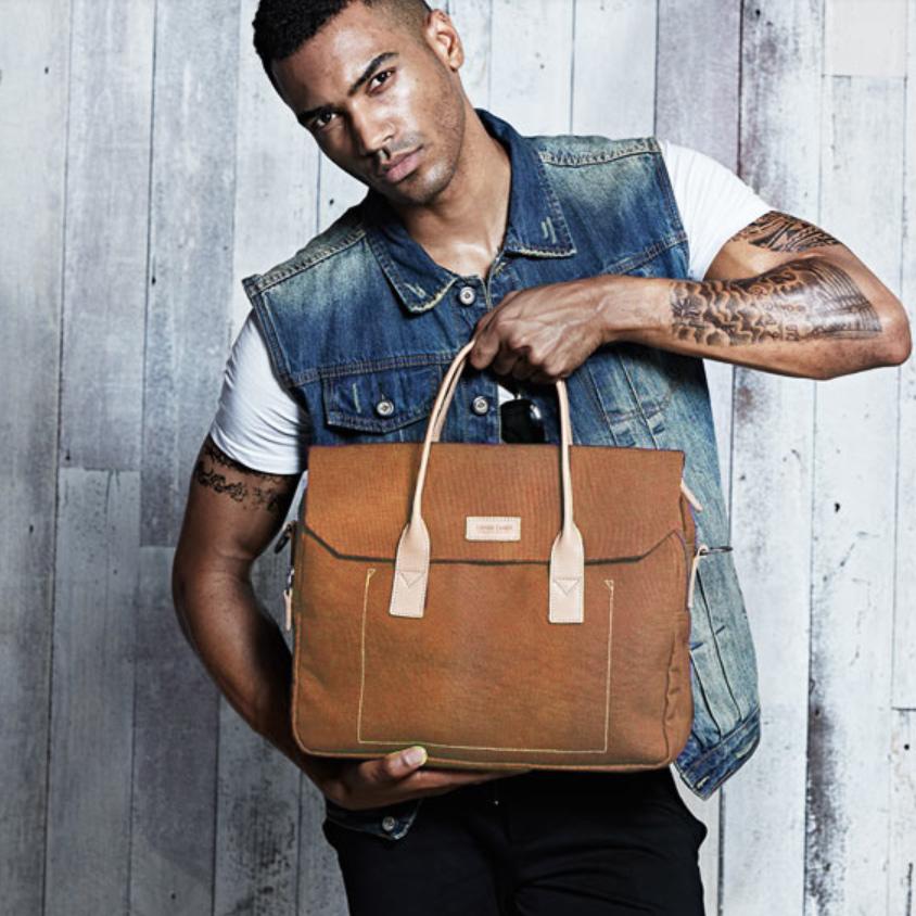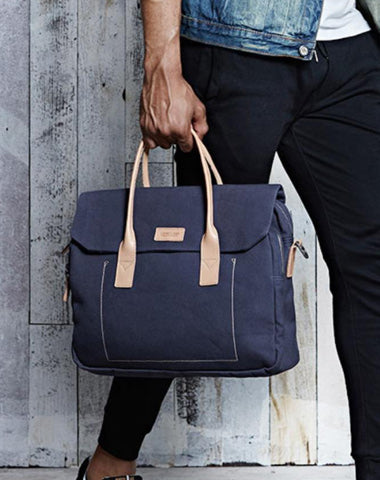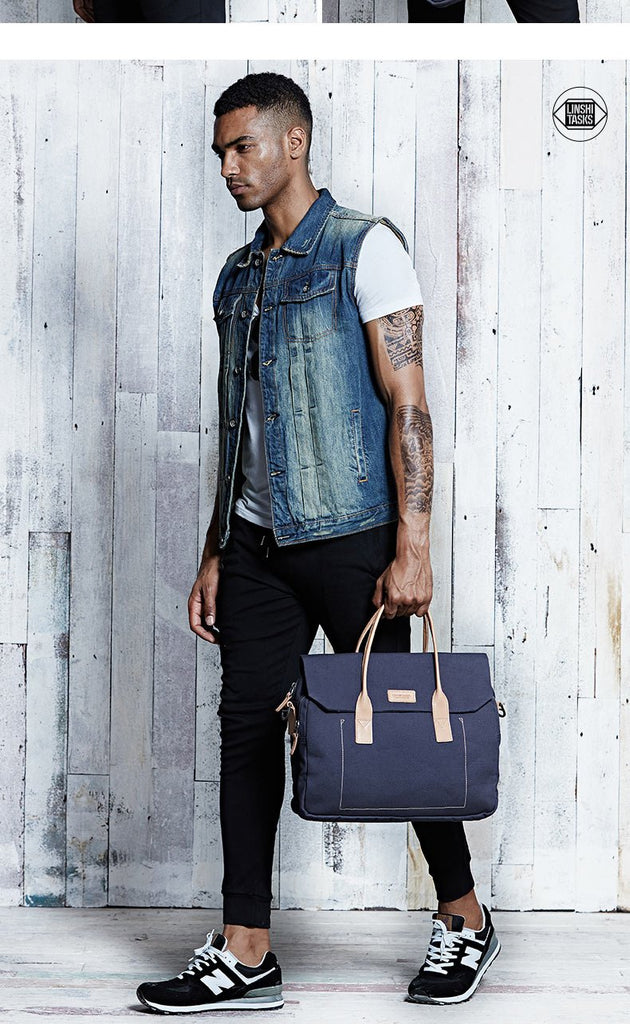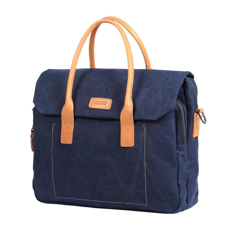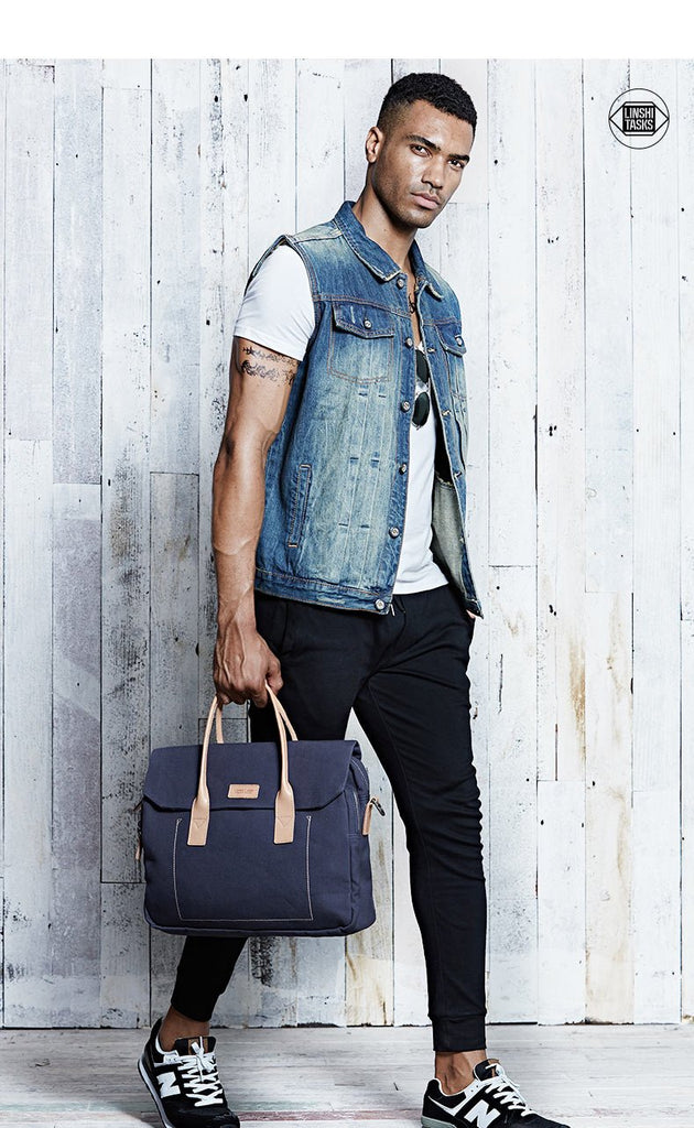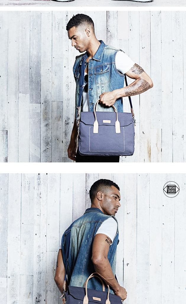 Design: Navy Blue Leather Waxed Canvas Mens Briefcase Messenger Bags Brown Casual Shoulder Bags for Men