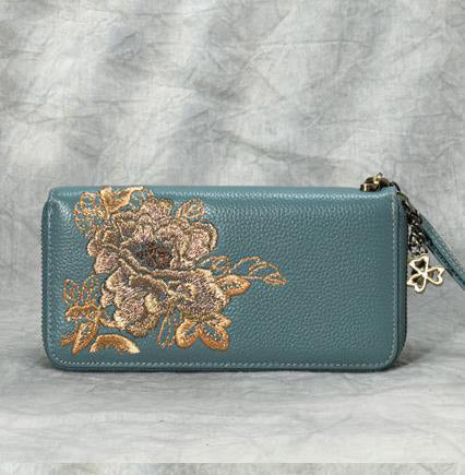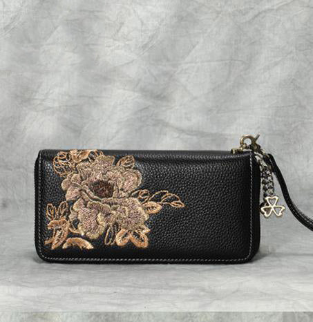 Style: Handmade Embroidery Leather Peony Wristlet Wallet Womens Zip Around Wallets Flowers Peony Ladies Zipper Clutch Wallet for Women