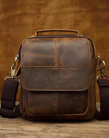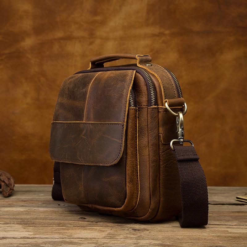 Style: Vintage Brown Leather Mens Small Vertical Side Bags Shoulder Bags Messenger Bag For Men