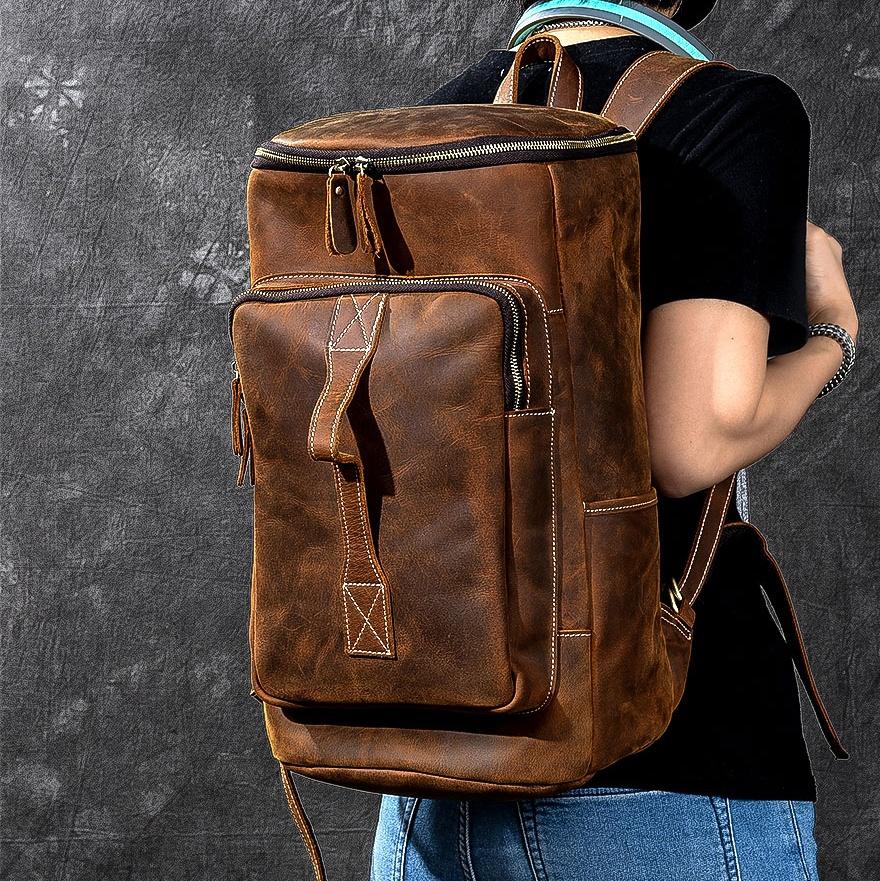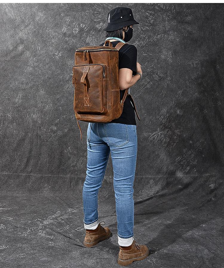 Design: Retro Brown Leather Mens 14" Laptop Backpack Hiking Backpack Travel Backpack Large Backpack for Men