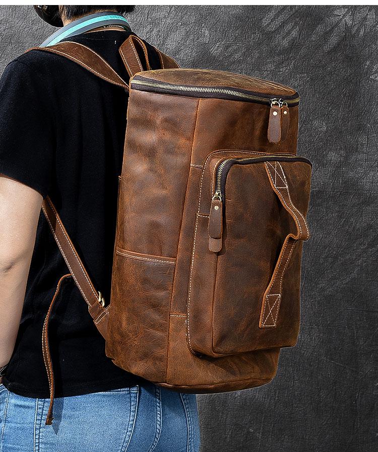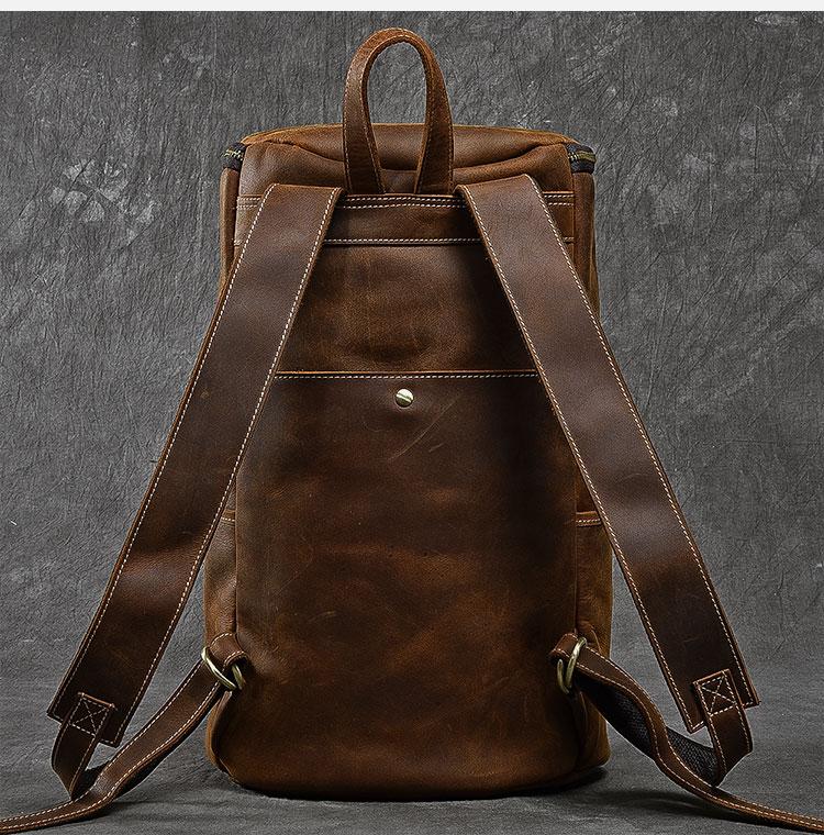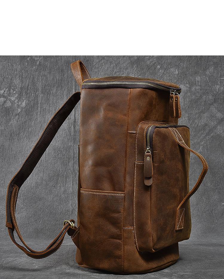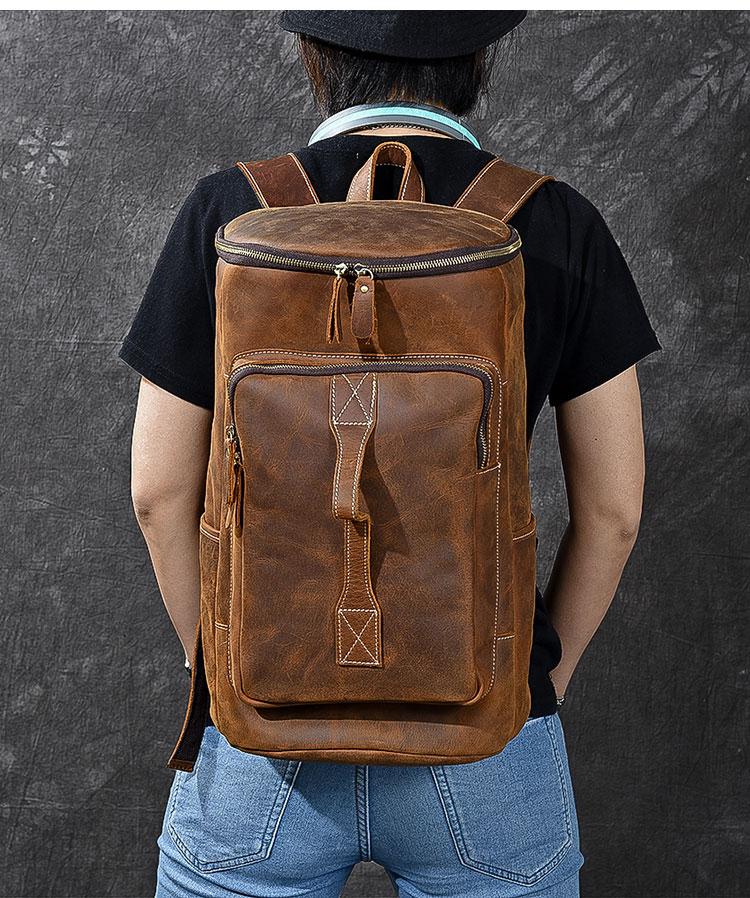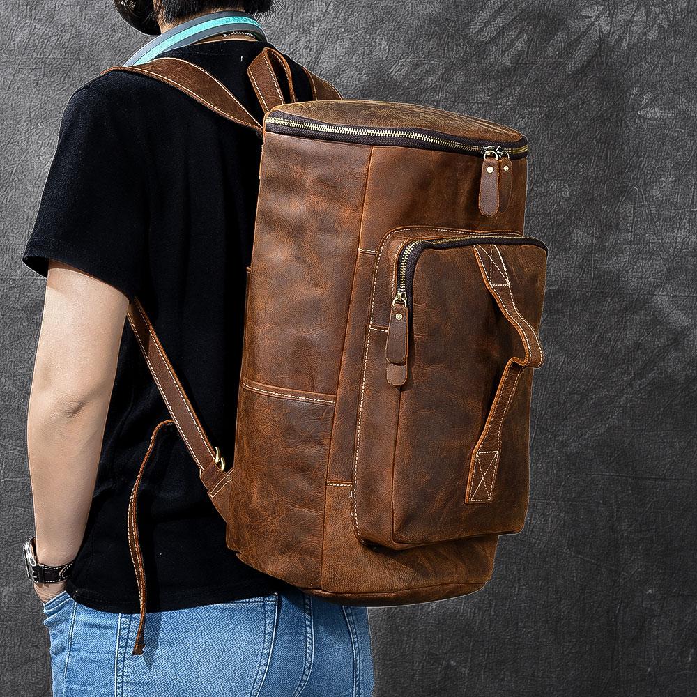 Retro Brown Leather Men 14" Barrel Laptop Backpack Hiking Backpack Travel Backpack Large Backpack for Men