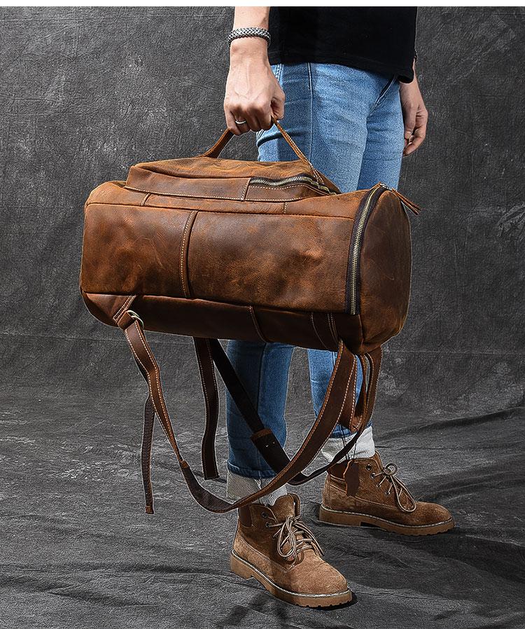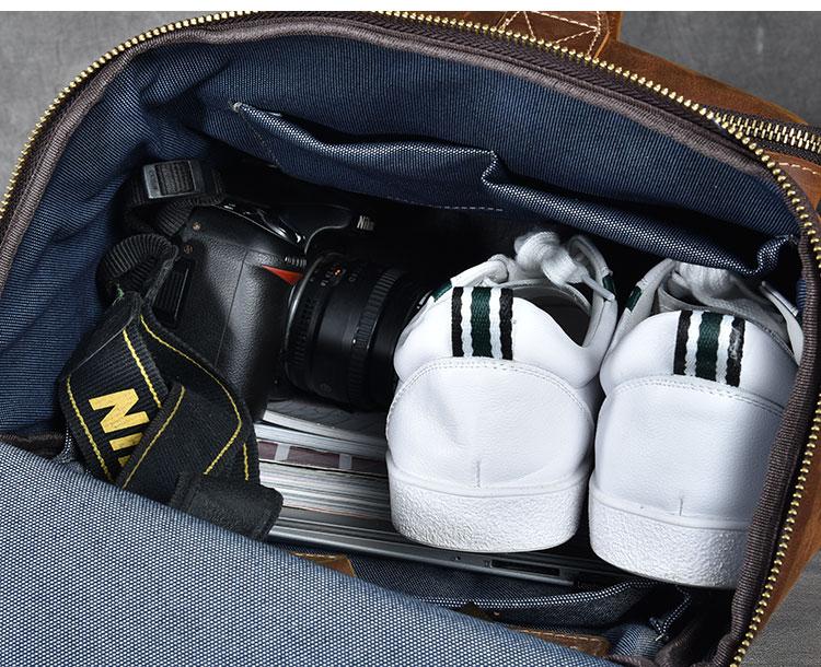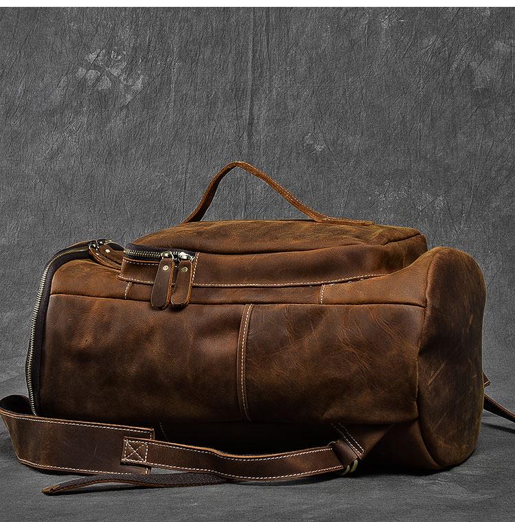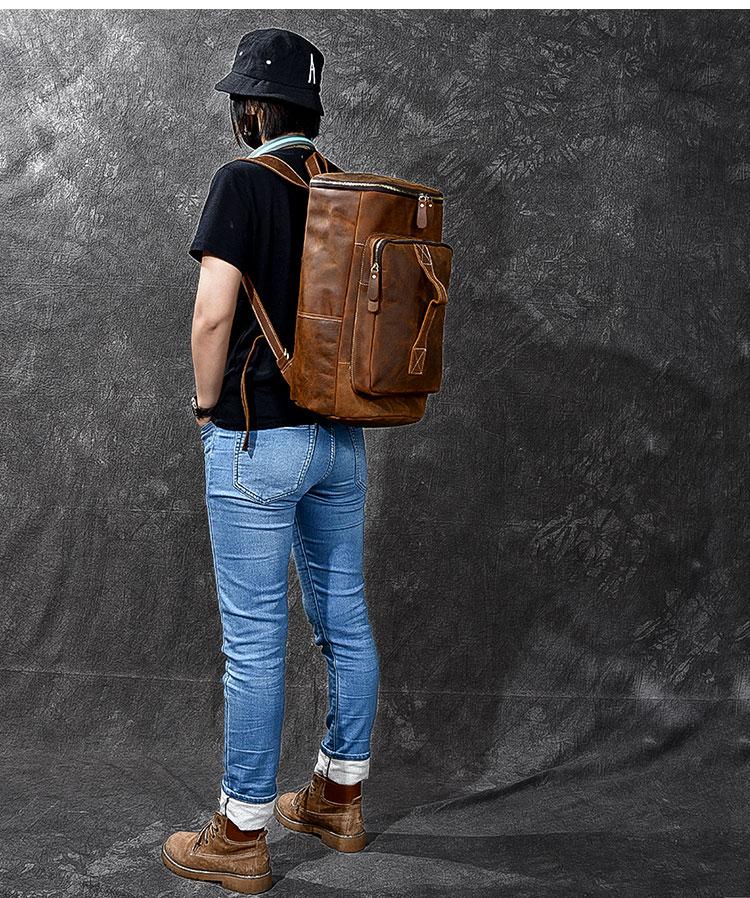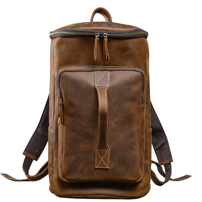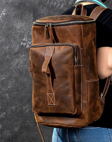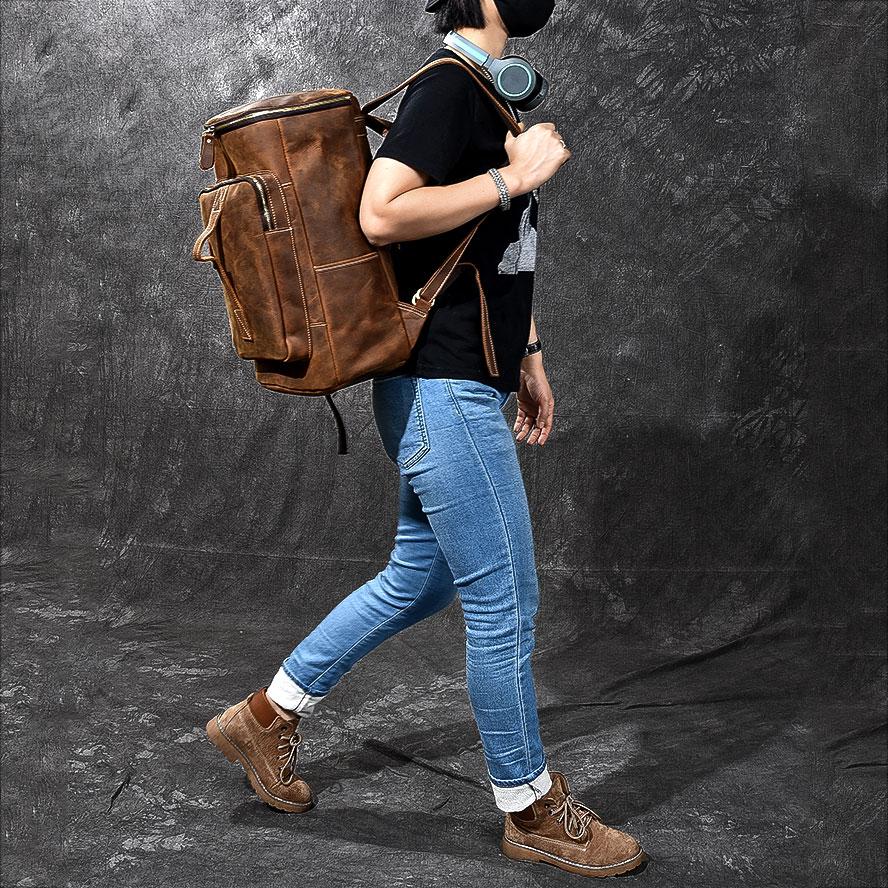 Retro Brown Leather Men 14" Barrel Laptop Backpack Hiking Backpack Travel Backpack Large Backpack for Men