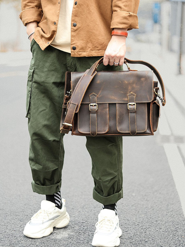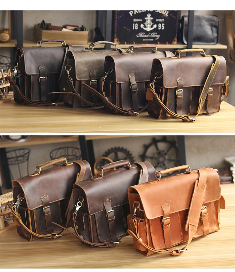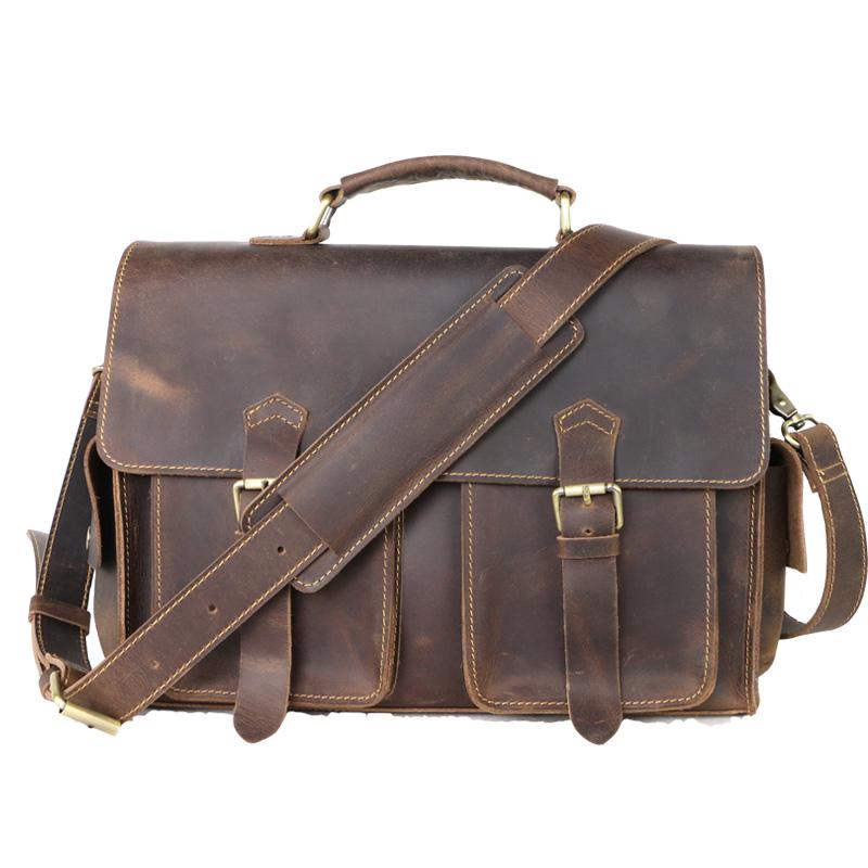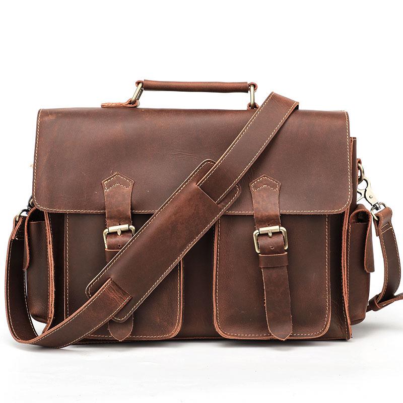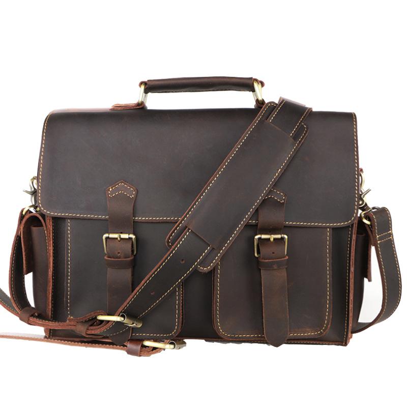 Style: Retro Deep Brown Leather Mens 14 inches Briefcase Dark Gray Work Briefcase Handbags For Men